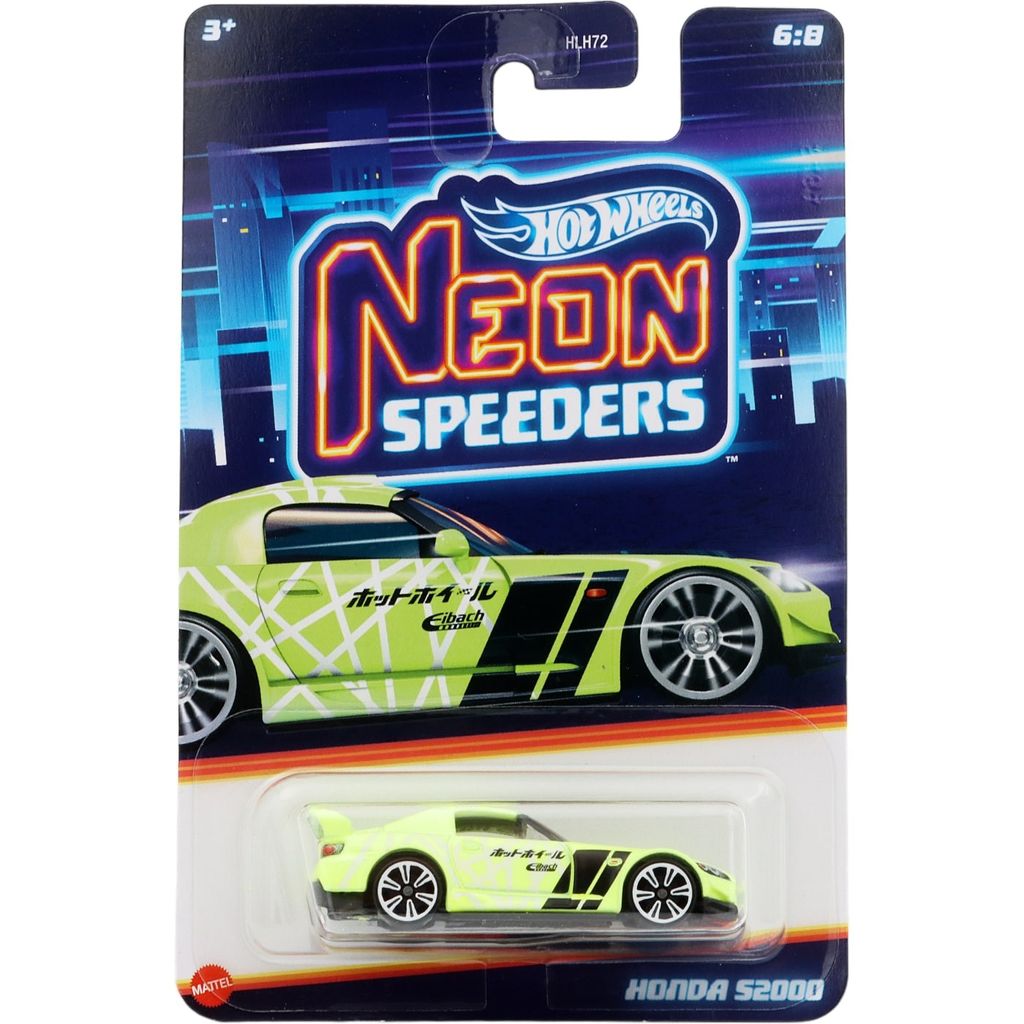 Neongrøn Honda S2000 fra Hot Wheels og Neon Speeders-serien, hvor denne bil er nummer 6 ud af 8 i serien.