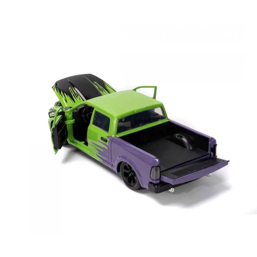 Figuren Hulk ("The Hulk") fra og en lilla og grøn 2014 RAM 1500 fra Jada Toys i skala 1:24 (længde 22 cm).