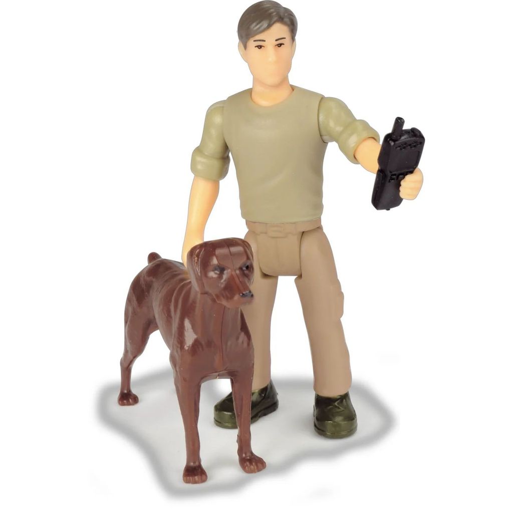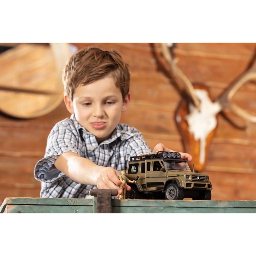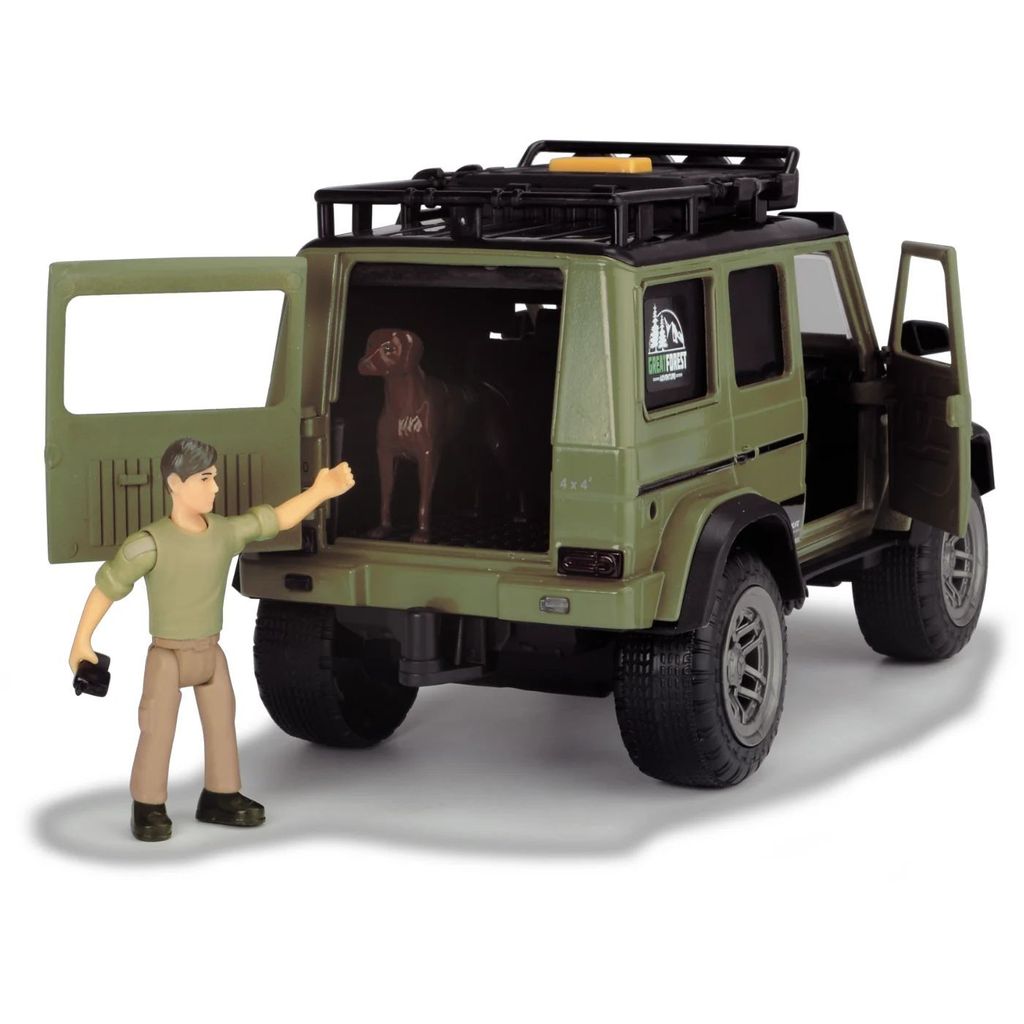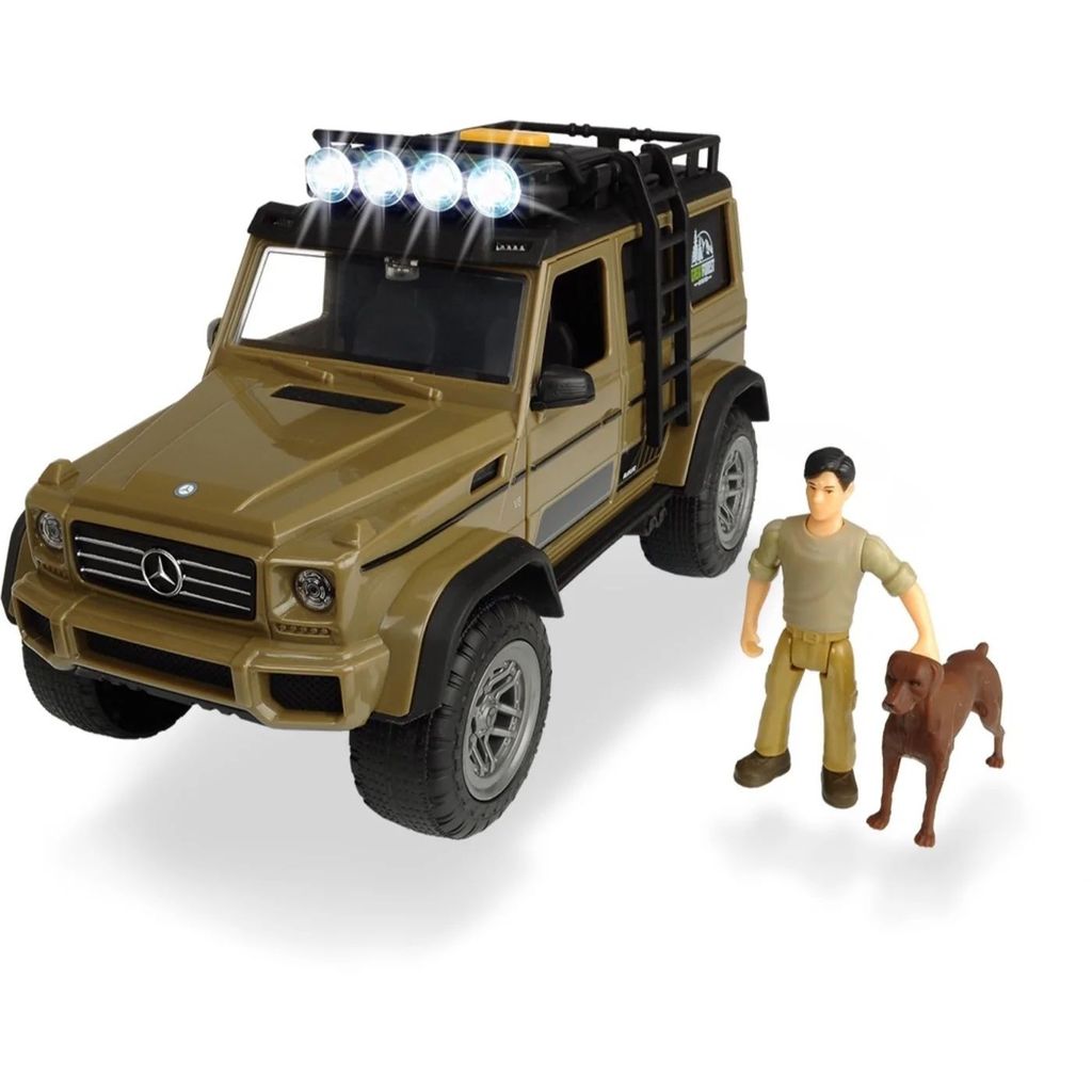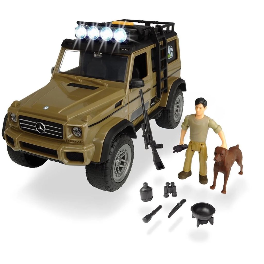 Hunter Set / Ranger Set fra Dickie Toys er en Mercedes Benz G-Klasse (jeep) med figur, hund og forskelligt tilbehør. Jeepen har lyd- og lysfunktioner.