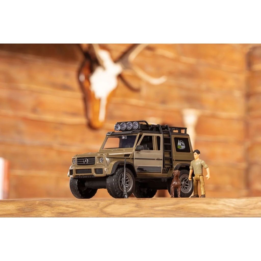 Hunter Set fra Dickie Toys er et legesæt, der indeholder en olivengrøn Mercedes-jeep (G-klasse), en figur, en hund og en række mindre tilbehør, som en jæger har brug for.
