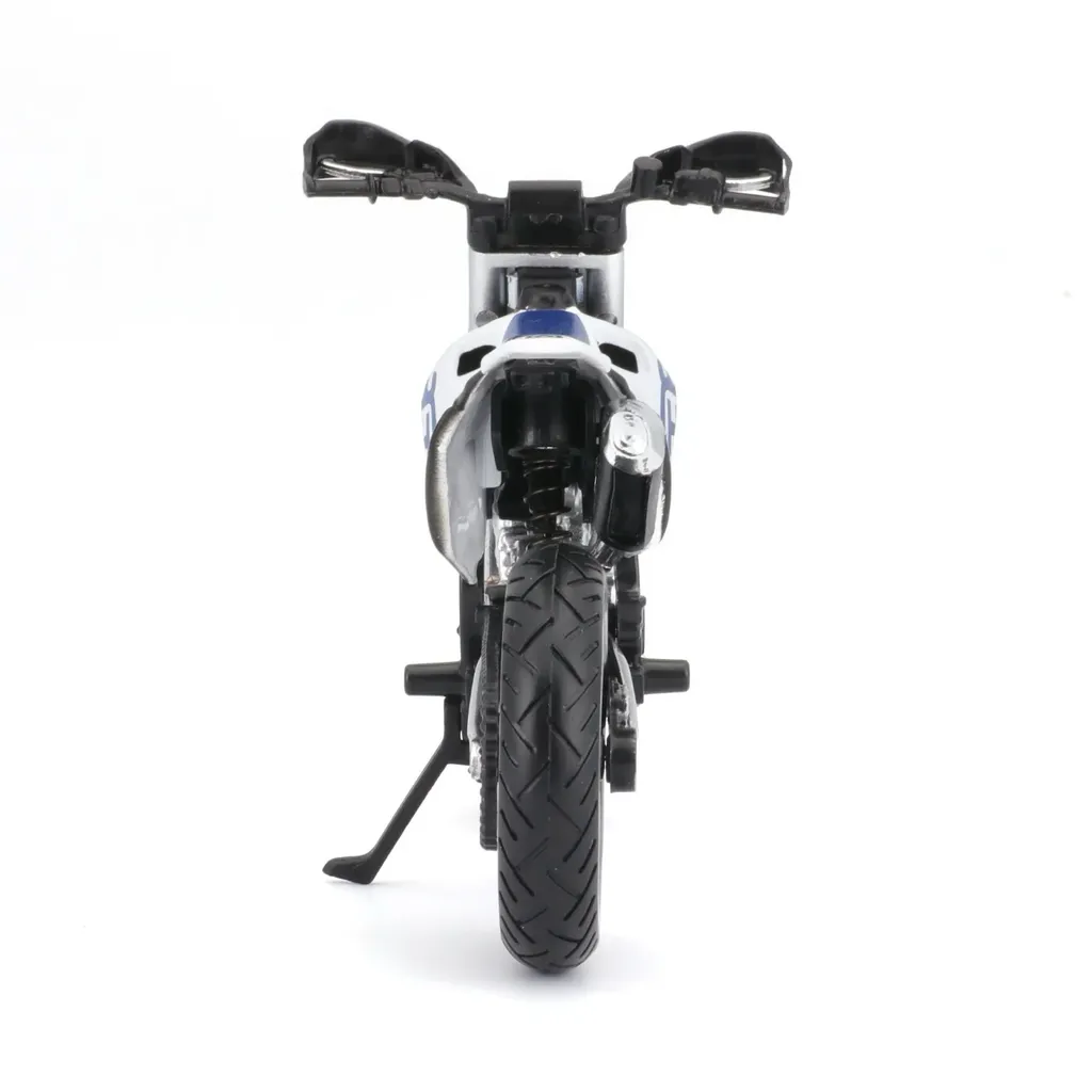 Husqvarna supermoto-motorcykel i skala 1:18, 11 cm lang. Motorcyklen er en model af Husqvarna FS 450-motorcyklen fra det italienske mærke Bburago i metal med plastdetaljer.