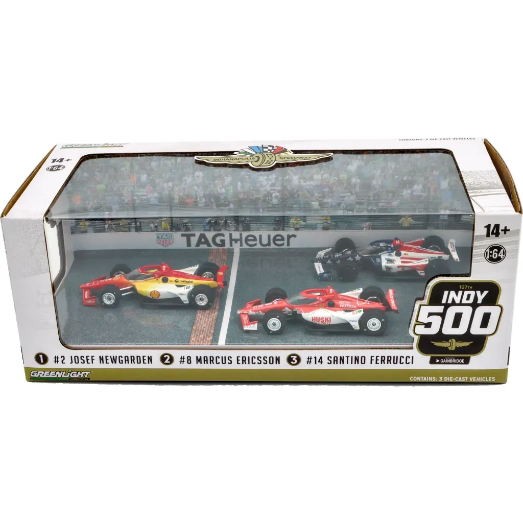 Tre Indycars fra GreenLight i skala 1:64 (7,8 cm). Bilerne er top 3 fra Indy 500 i 2023 med Josef Newgarden, Marcus Ericsson og Santino Ferrucci.