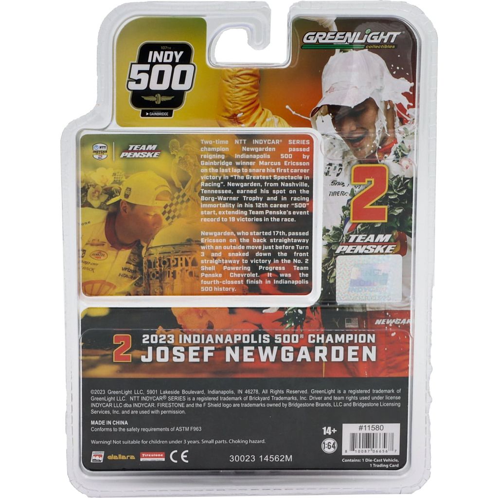 Josef Newgardens sejr i Indianapolis 500 (Indy 500) i 2023 fejres med denne fine modelbil i skala 1:64 (8 cm) fra GreenLight.