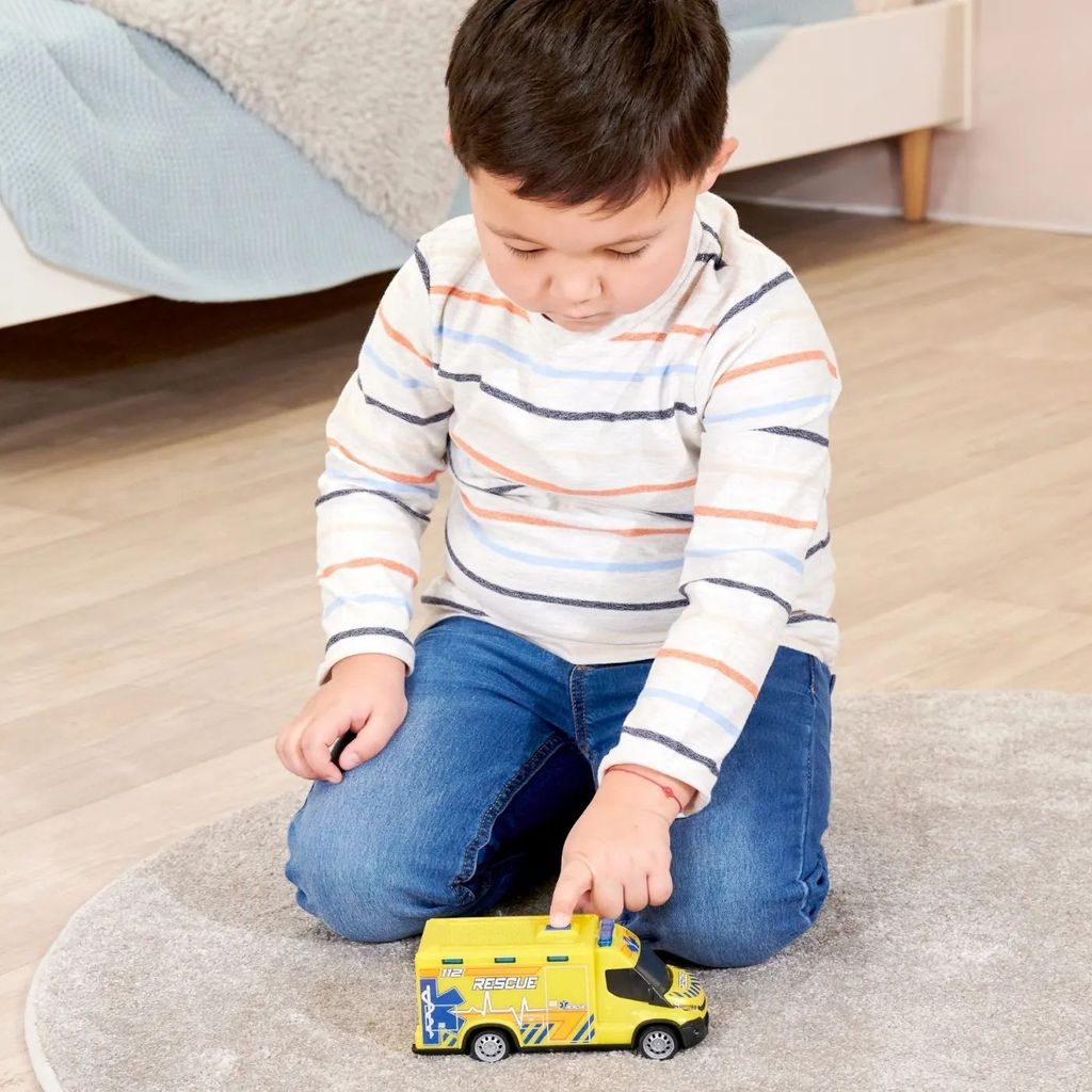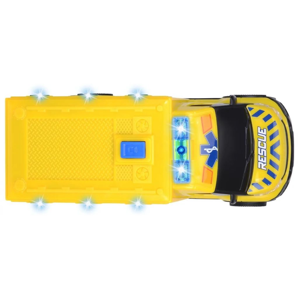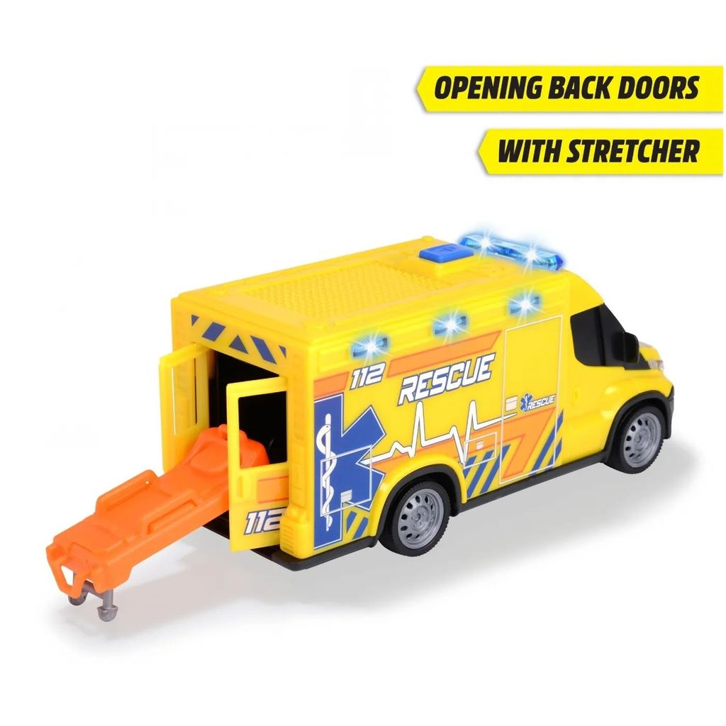 Ambulancen er 17,5 cm (skala 1:32) lang og har lyd- og lysfunktioner, som aktiveres ved at trykke på knappen på ambulancens tag. Lydene er startlyde (tænding), motorlyde og sirener, radiokommunikation og bagrør. På taget er der blå lys, som lyser og blinker. Lyd- og lysfunktionerne kræver 2 AAA-batterier, som medfølger, men du er velkommen til at købe ekstra.