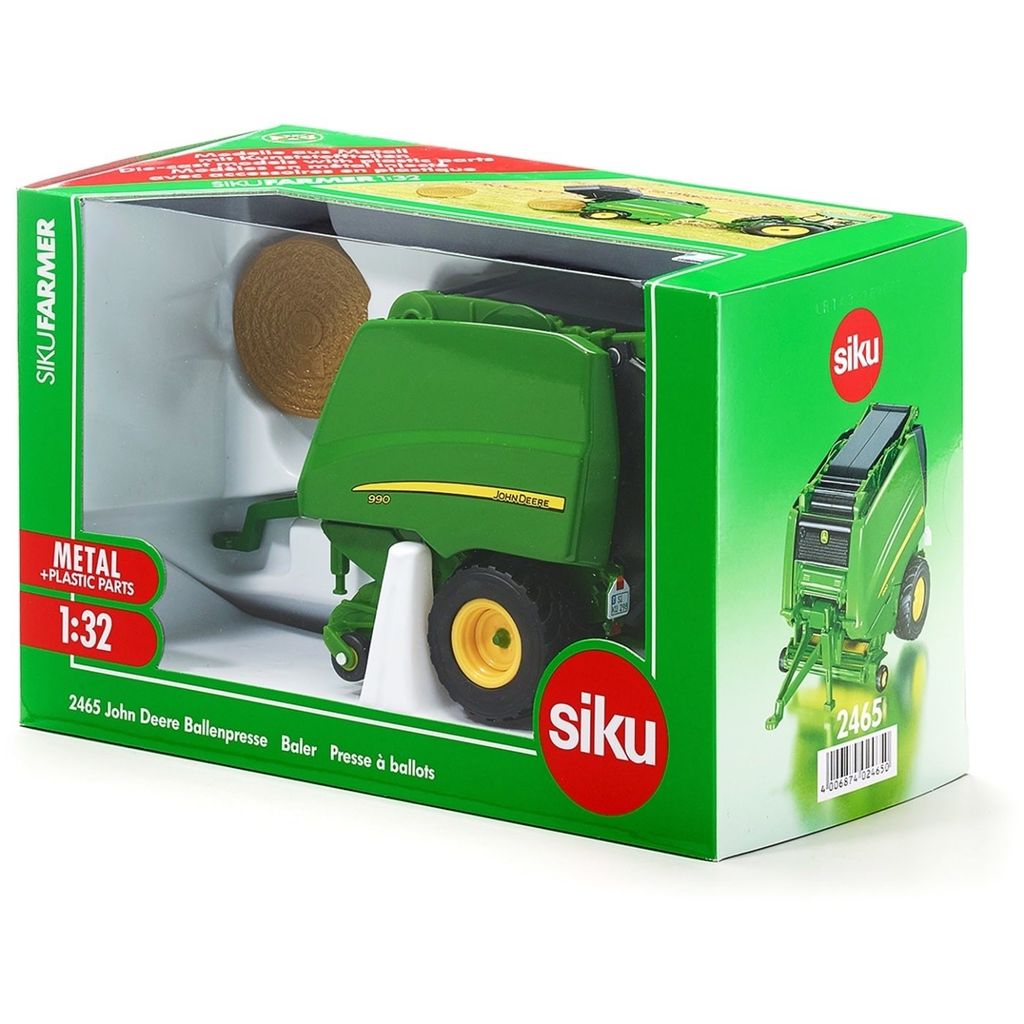 John Deere 990 rundballepresser i skala 1:32 (17 cm lang og 9 cm høj). Presseren er fremstillet af Siku og passer til Siku-traktorer i skala 1:32.