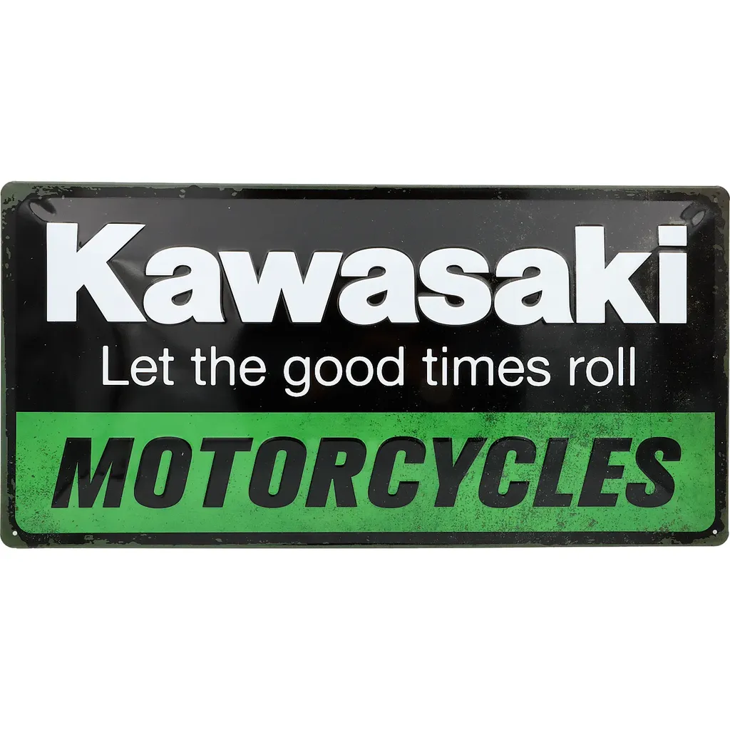 Grønt, sort og hvidt blikskilt med teksten Kawasaki Let the good times roll Motorcycles. Skiltet er 50 cm bredt og 25 cm højt.