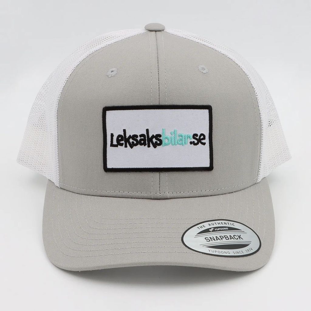 Sølv/hvid/grå truckerkasket med vores logo, "Leksaksbilar.se", omkranset.