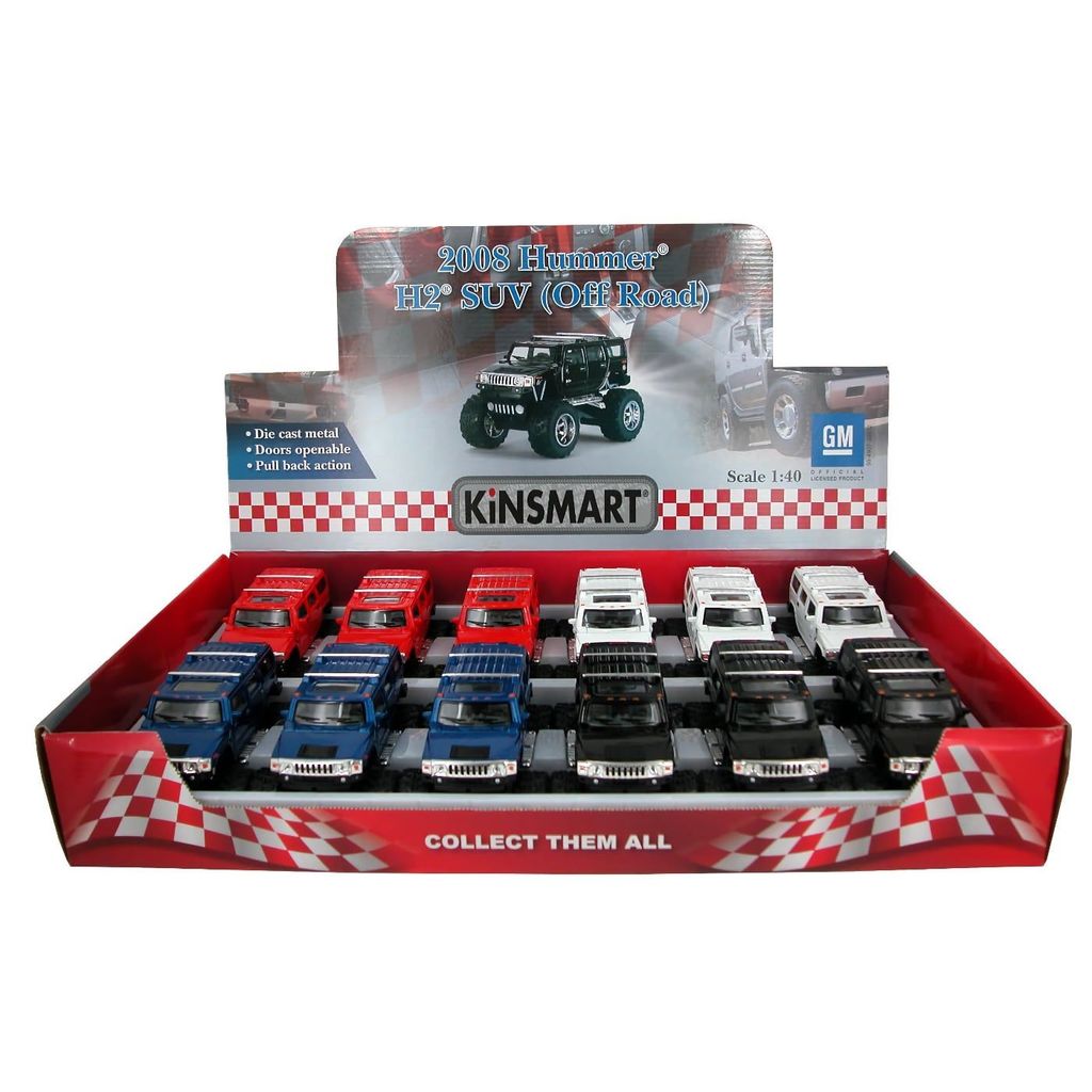 Hummer i skala 1:40 fra Kinsmart. En flot legetøjsbil med pullback, støddæmpere og høj frihøjde til at komme over tæppekanter og andet affald i hjemmet.