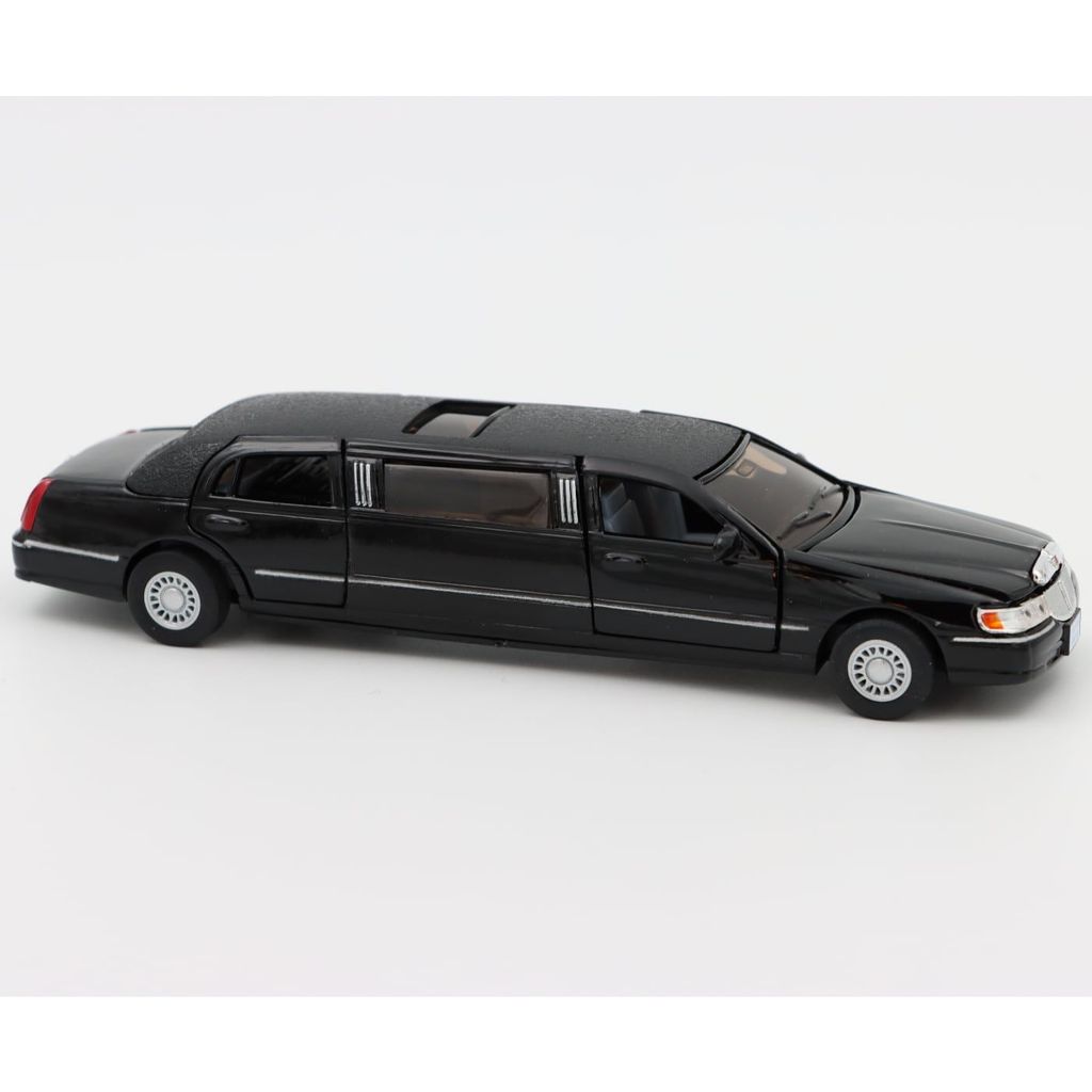 Kinsmart 1999 Lincoln Town Car Stretch Limousine i skala 1:38 med tilbagetrækning og døre, der kan åbnes, soltag og motorhjelm.