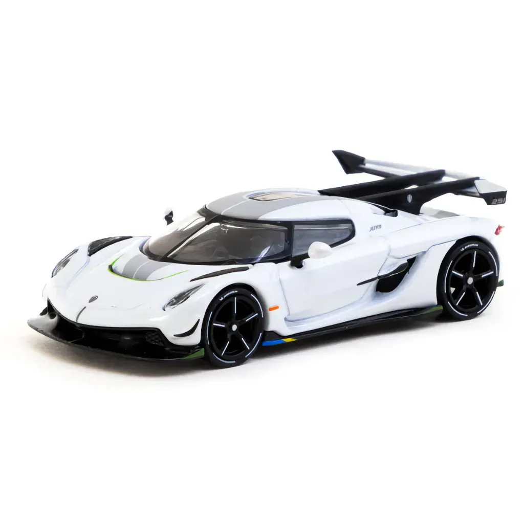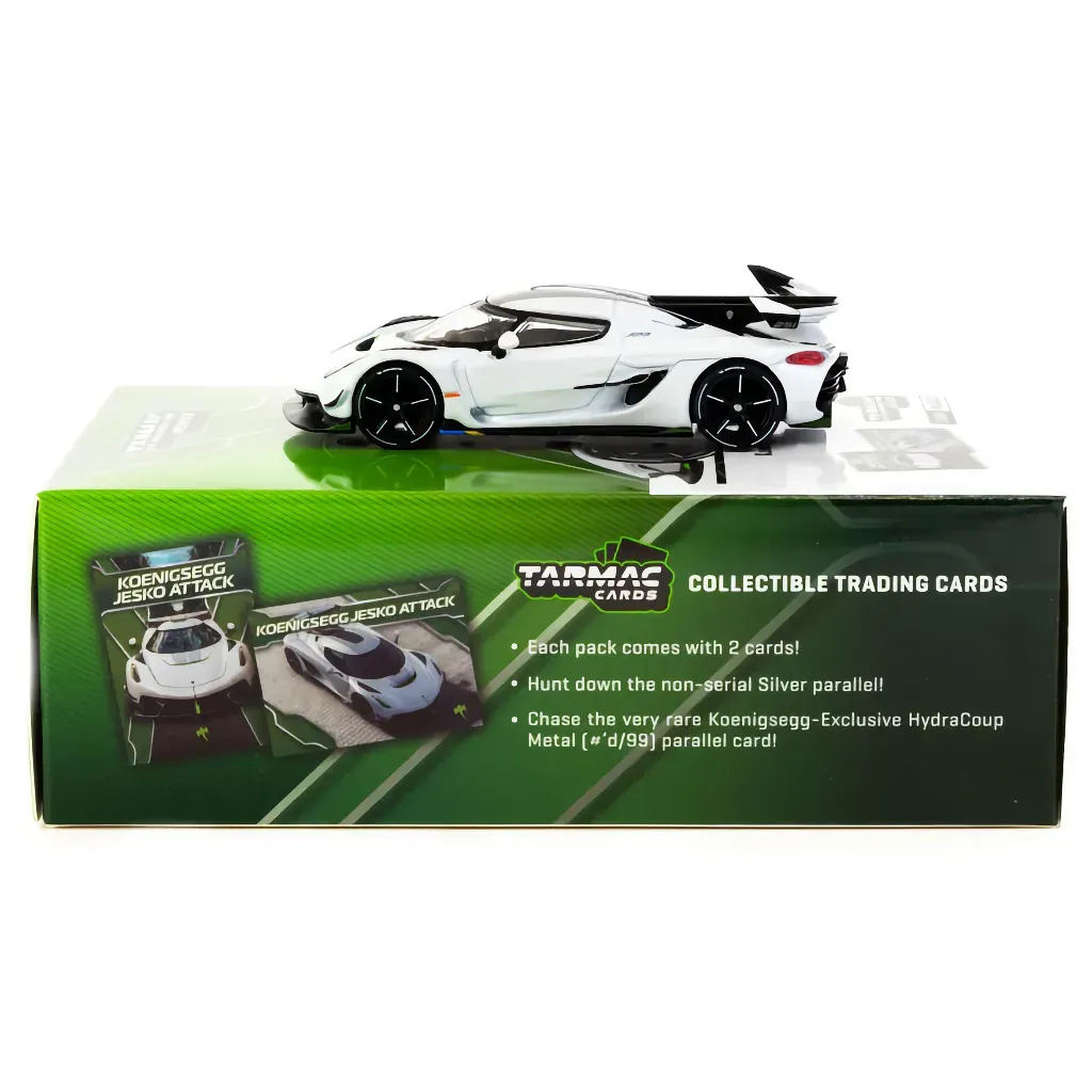 Koenigsegg Jesko Attack i hvid som modelbil fra Tarmac Works og deres GLOBAL64-serie. Bilen er ca. 7 cm (skala 1:64).