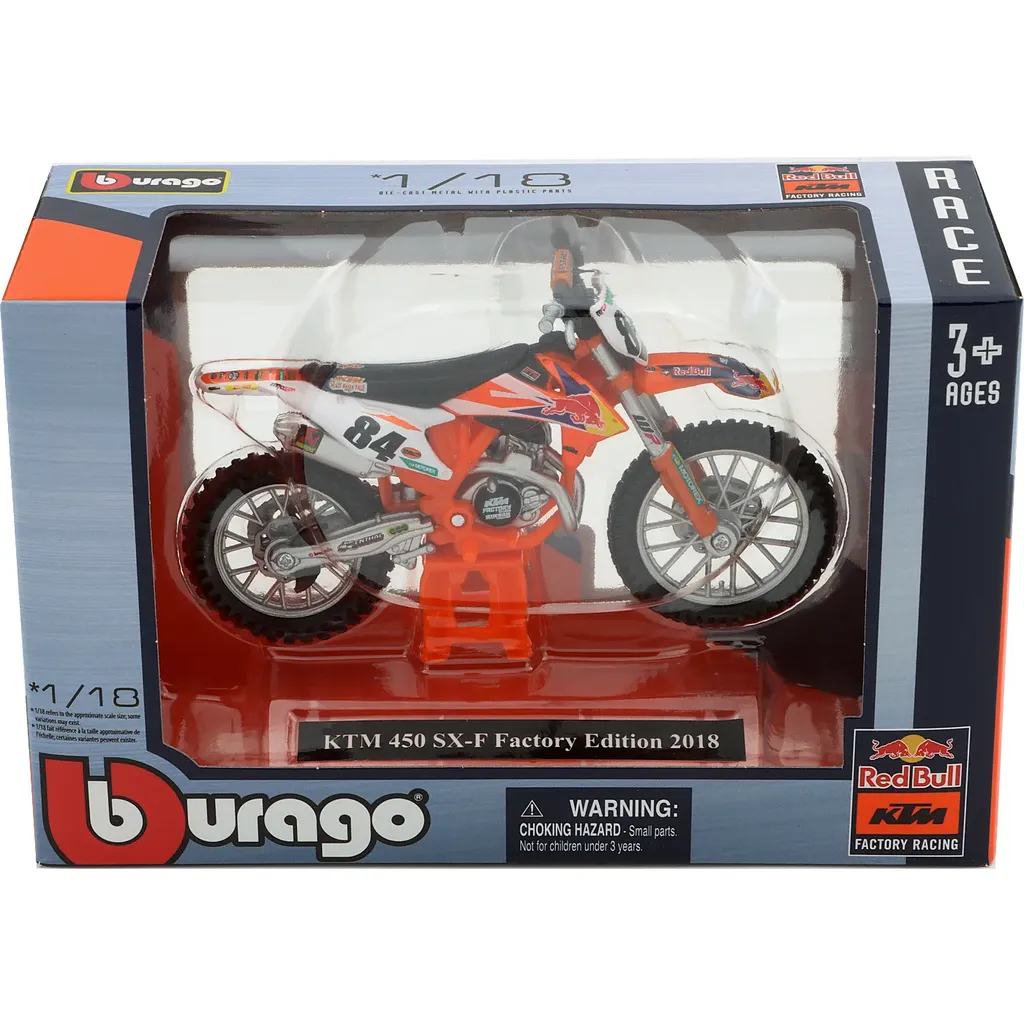 KTM 450 SX-F Factory Edition 2018 som model/legetøj fra Bburago i skala 1:18 (12 cm lang).