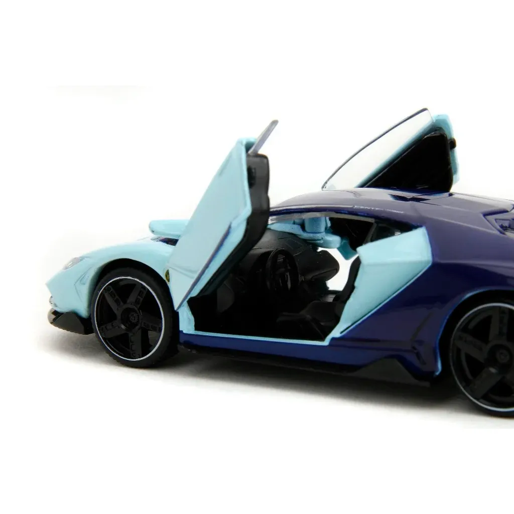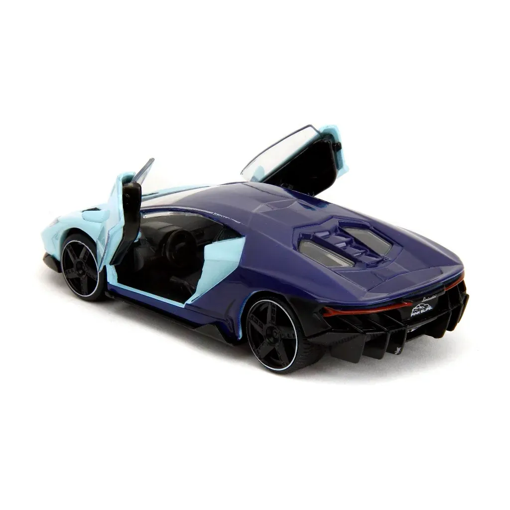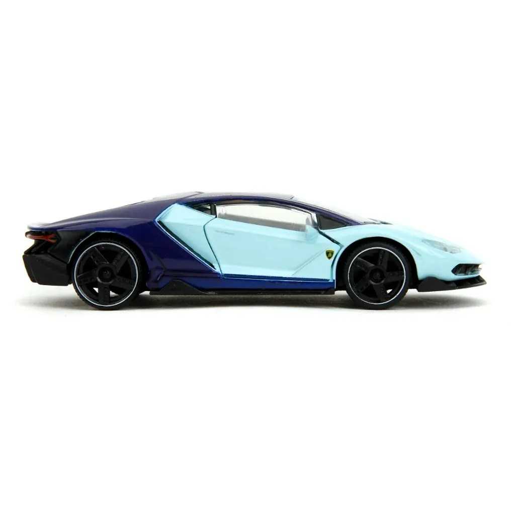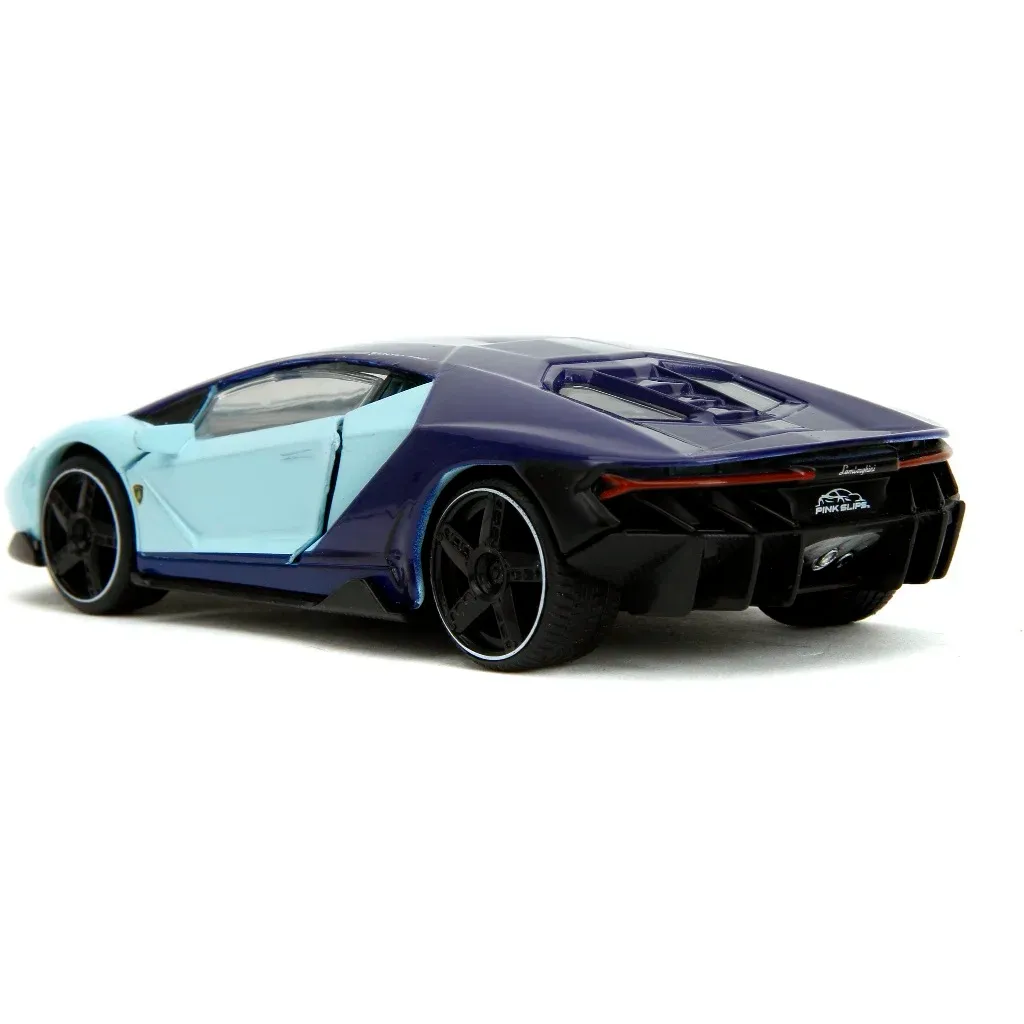 Lyseblå og lilla Lamborghini Centenario med sorte fælge fra Jada Toys og Pink Slips-serien. Bilen er 13 cm lang (skala 1:32).