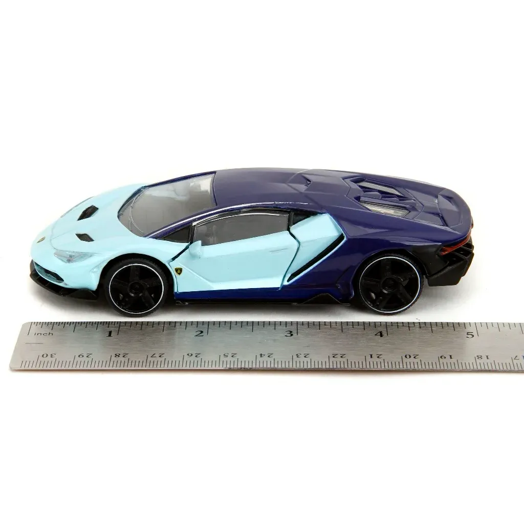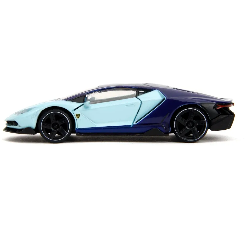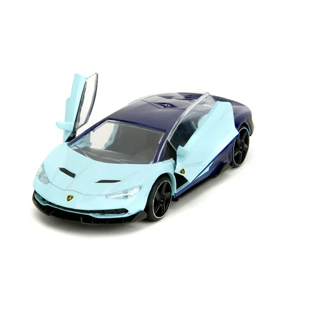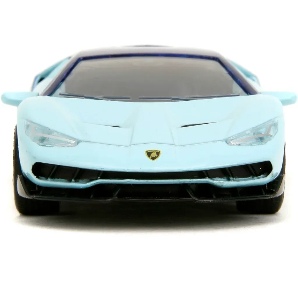Lyseblå og lilla Lamborghini Centenario med sorte fælge fra Jada Toys og Pink Slips-serien. Bilen er 13 cm lang (skala 1:32).