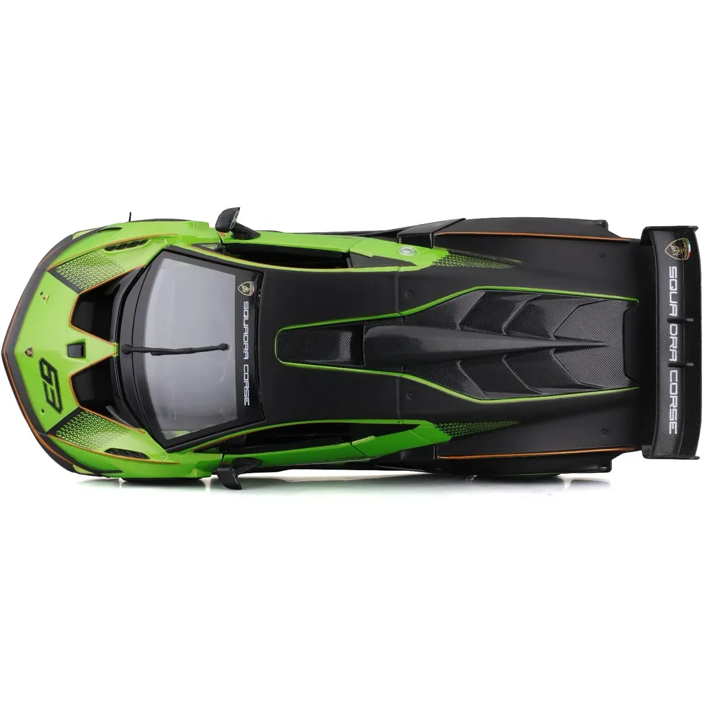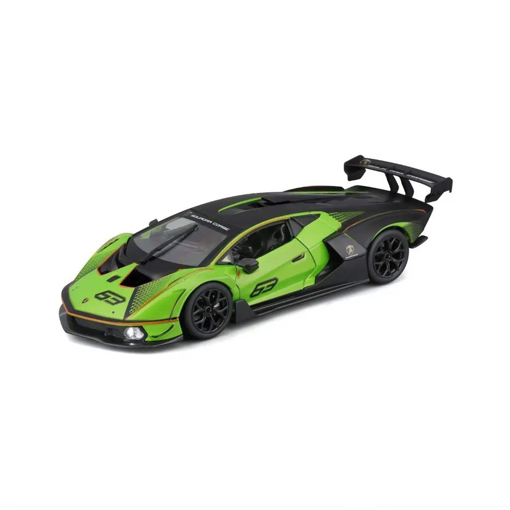 Grøn og sort Lamborghini Essenza SCV12 legetøjsmodel fra Bburago. Bilen er i skala 1:24 (21 cm) og har døre, der kan åbnes.