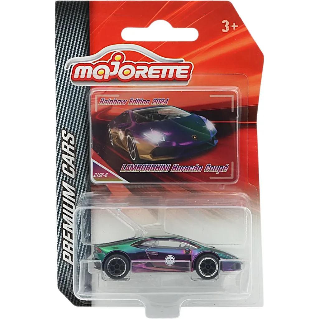 BEMÆRK VENLIGST! Maks. 1 køb pr. kunde. Lamborghini Huracán Coupé fra Majorette og Premium Cars-serien, hvor denne bil er en Rainbow Edition 2024 med en lilla og grøn (fedtet) metallak.