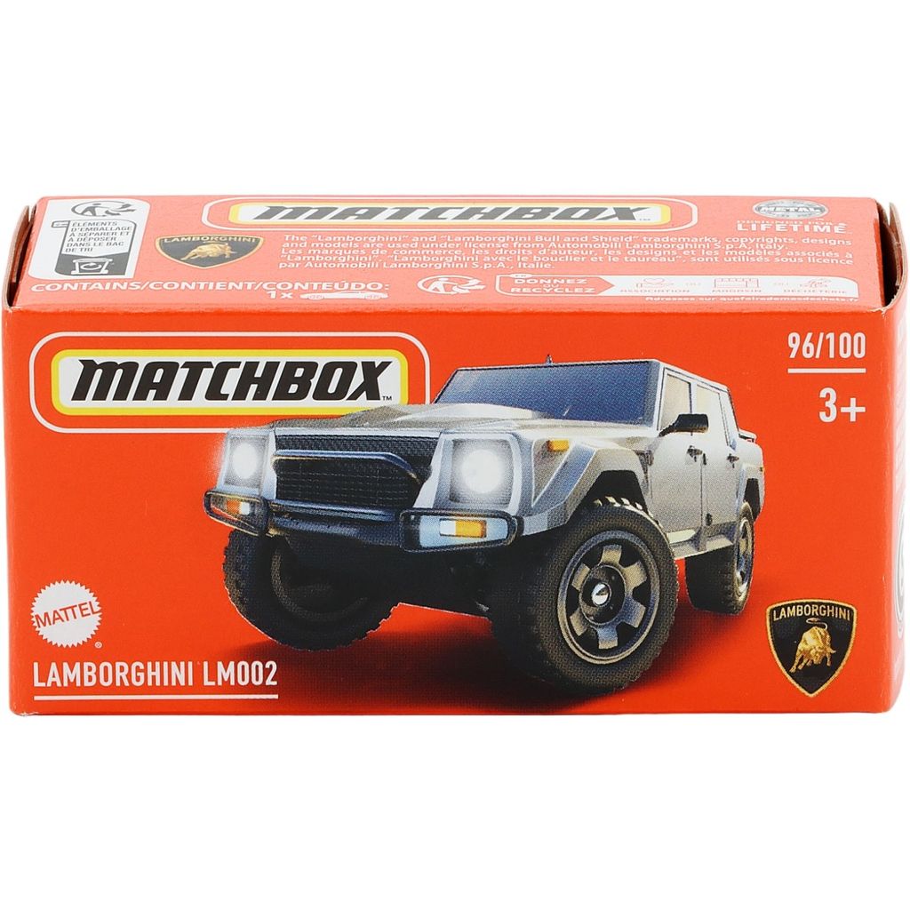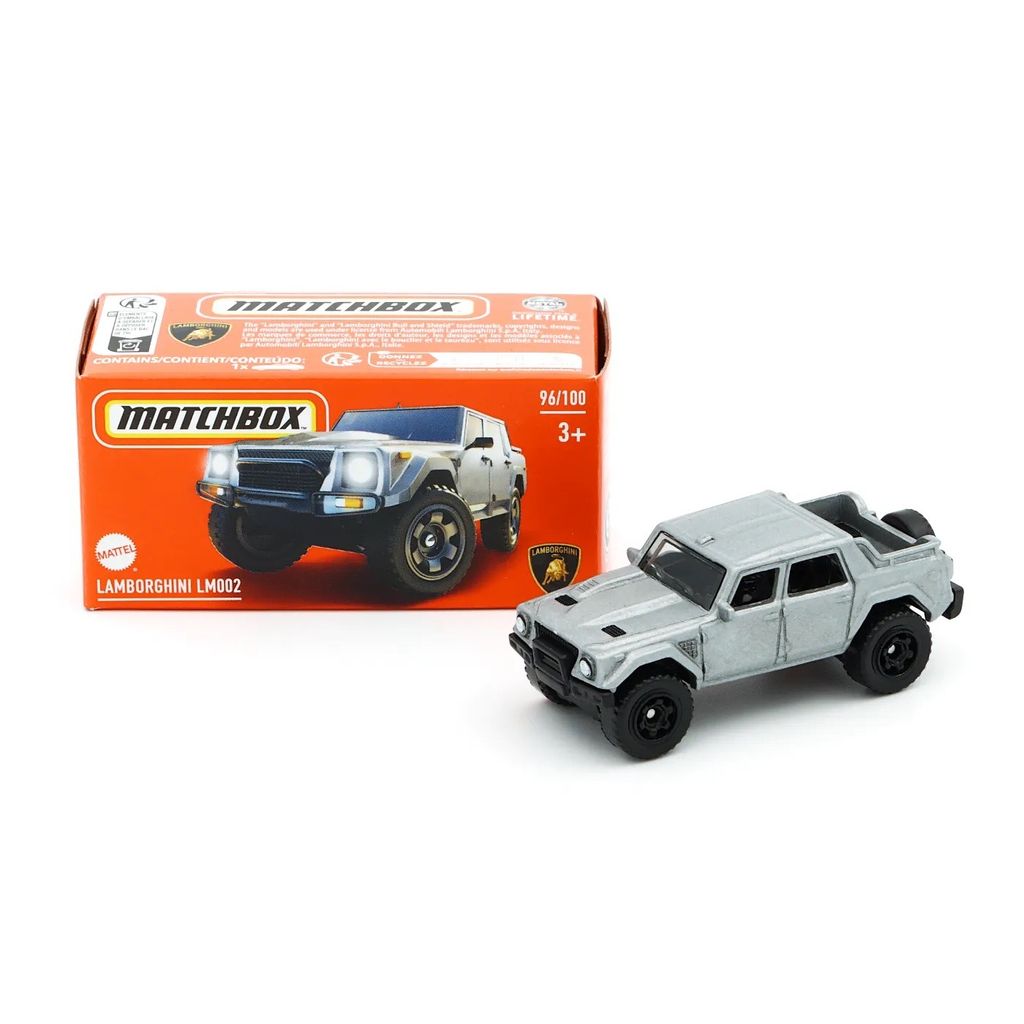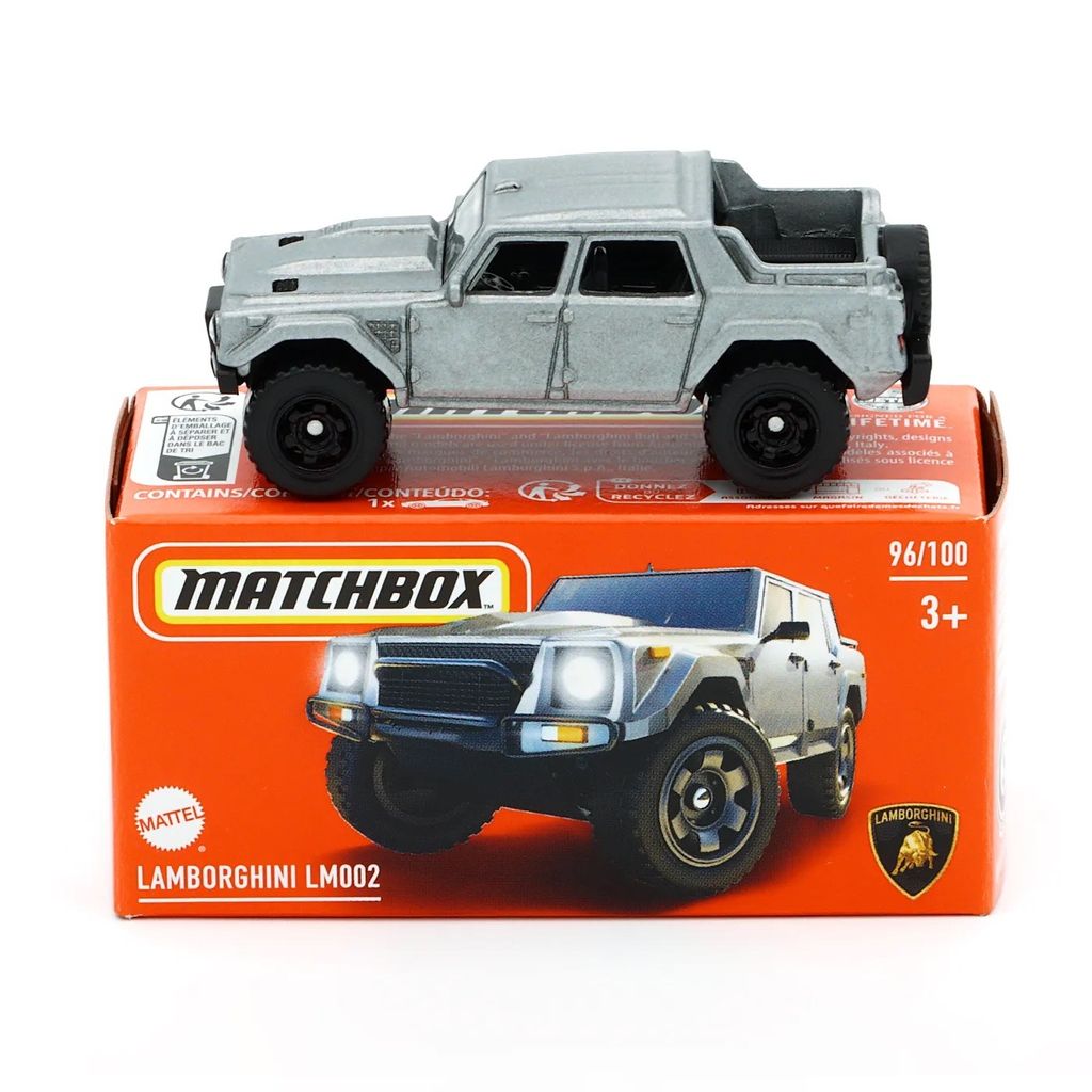 Grå (sølvmetallic) Lamborghini LM002 fra Matchbox og Power Grab-serien, hvor denne legetøjsbil er bil nummer 96/100.