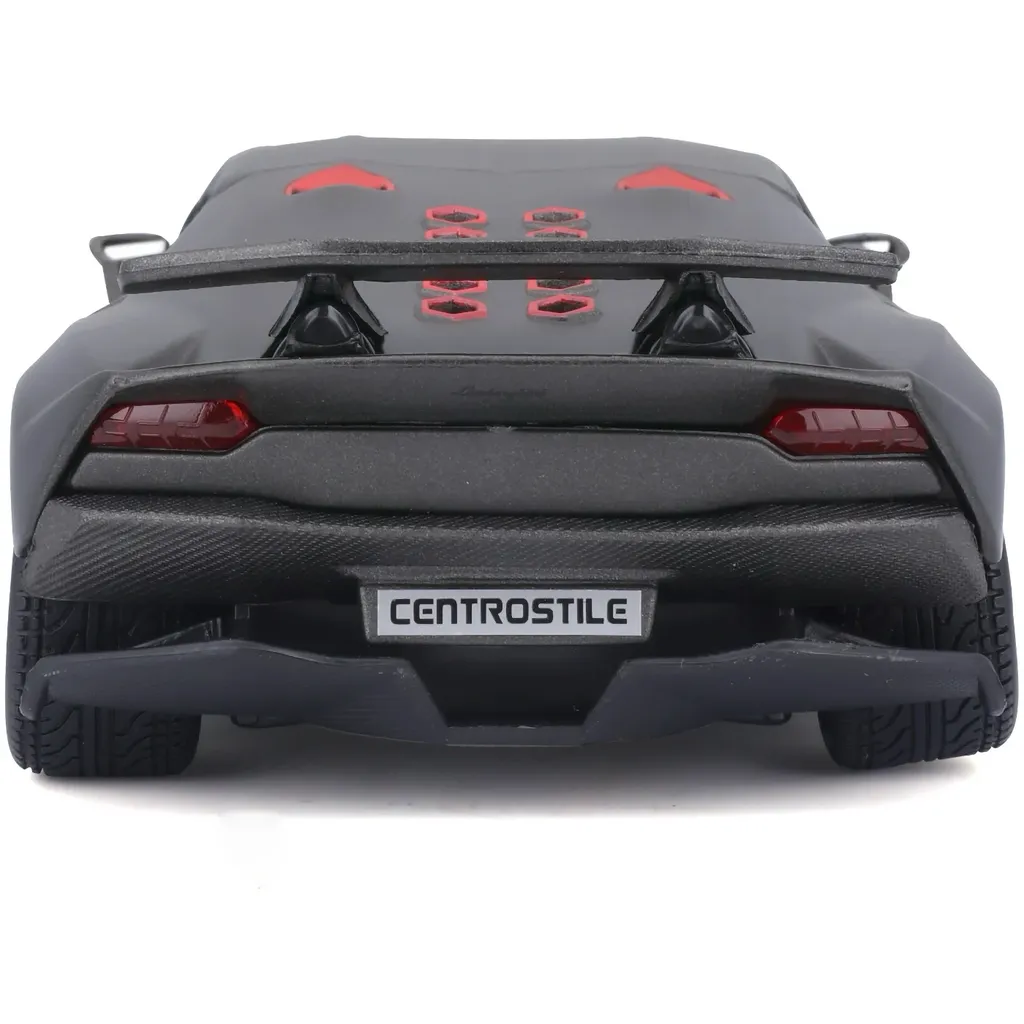 Grå (med røde detaljer) Lamborghini Sesto Elemento, modelår 2012, som legetøjsmodel fra Bburago. Bilen er i skala 1:24 (18,1 cm) og har døre, der kan åbnes.
