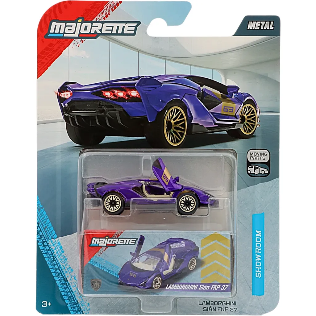 Lamborghini Sián FKP 37 fra Majorette og Showroom Deluxe Cars-serien. Bilen har gummidæk, er ca. 7 cm lang og lavet af metal med plastdetaljer.