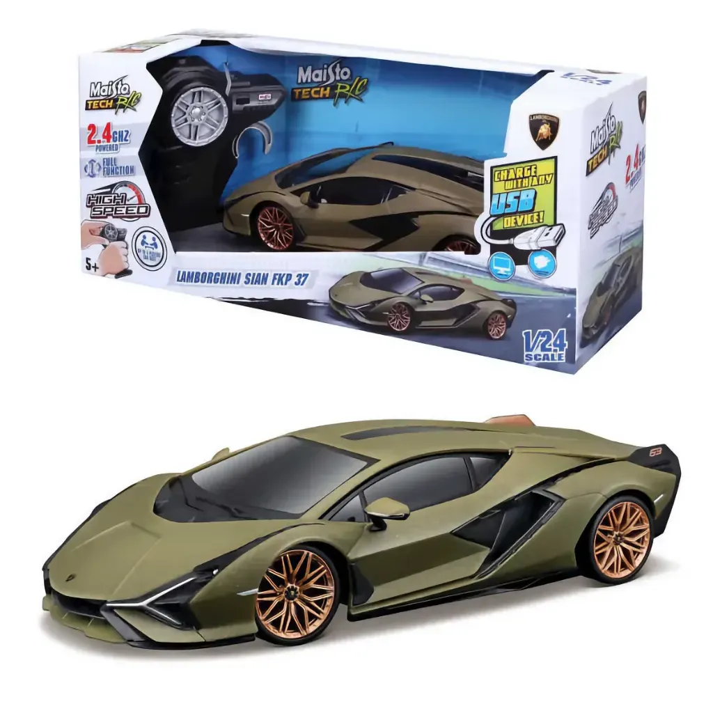 Olivengrøn Lamborghini Sián FKP37 som radiostyret bil fra Maisto og Tech R/C-serien. Bilen er 22 cm lang (skala 1:24) og har et batteri, der oplades med USB-kabel.