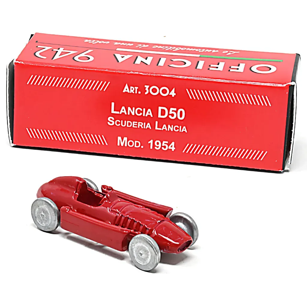 Rød Lancia D50 fra 1954 som model fra italienske Officina 942 i skala 1:76 (4,5 cm).