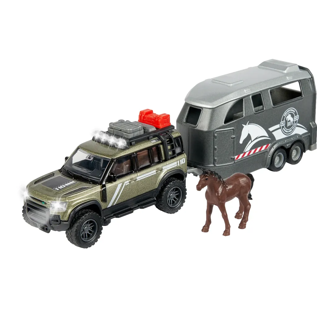 Fra Majorette Grand Series kommer dette fine batterilegetøj i metal i form af en Land Rover Defender-jeep med hestetrailer. Skalaen er 1:43, og der følger selvfølgelig en hest med.