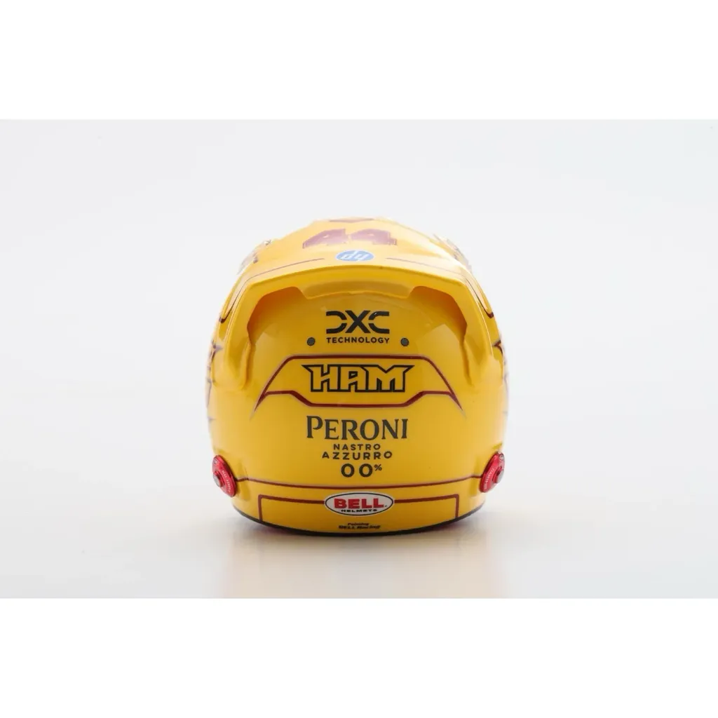 Dette er en identisk kopi af Hamiltons hjelm, som kan stå stolt på din bogreol, måske sammen med en flot model af den aktuelle Formel 1-bil, som i dette tilfælde er Ferrari SF-25 #44.