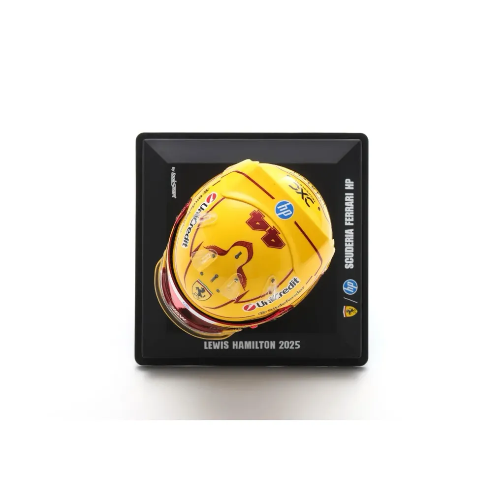 Lewis Hamiltons 2025-hjelm som model i skala 1:5 (6 cm lang) fremstillet af Looksmart. Lewis kører Ferrari SF-25 #44 for Scuderia Ferrari HP-teamet i 2025-sæsonen.