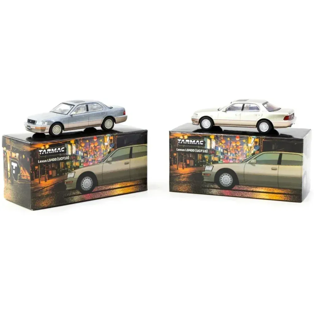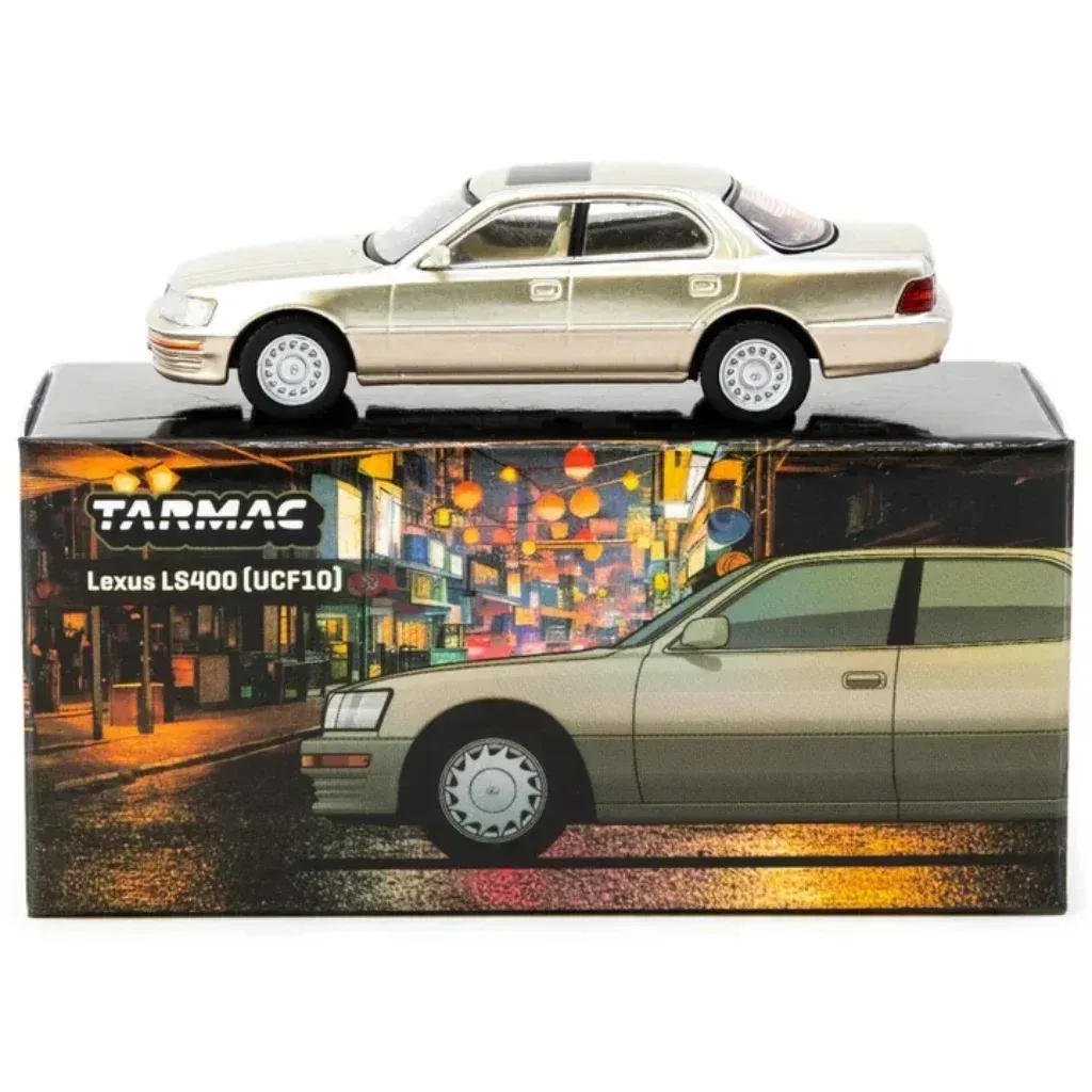 Lexus LS400 (UCF10) fra Tarmac Works i skala 1:64 (ca. 7 cm). Bilen er en del af Tarmacs GLOBAL64-serie. Lexus'en har en beige og champagnefarvet metallak.