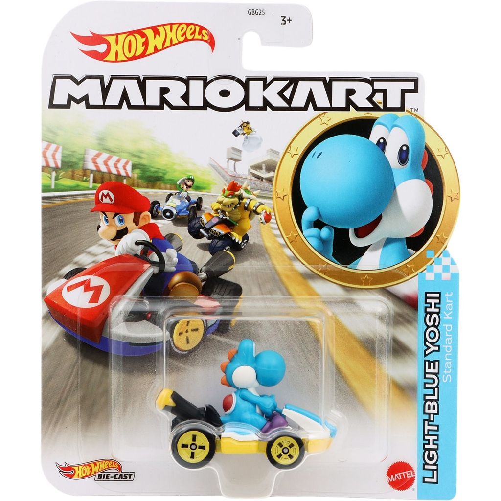 Fra Hot Wheels tilbyder vi denne Standard Kart fra Mario Kart, hvor Light-Blue Yoshi sidder bag rattet.