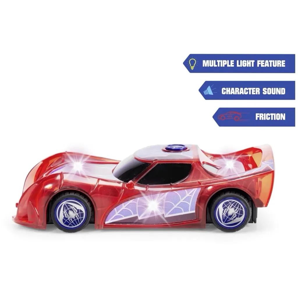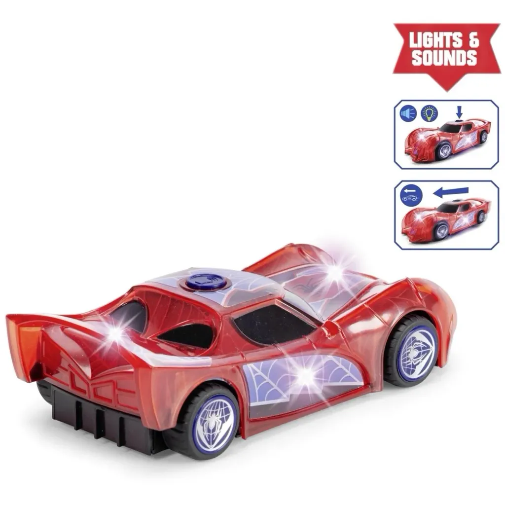 Spider-Man som legetøjsbil med lyd og lys fra Jada. Bilen er 15 cm lang og leveres med batterier.