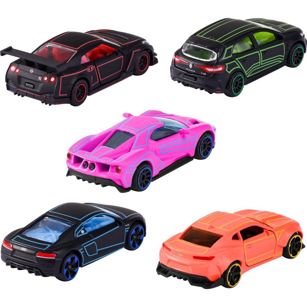 Fem legetøjsbiler i metal fra Majorette og deres "Light Racer Giftpack". Bilerne har en mat finish med neonfarvede detaljer.