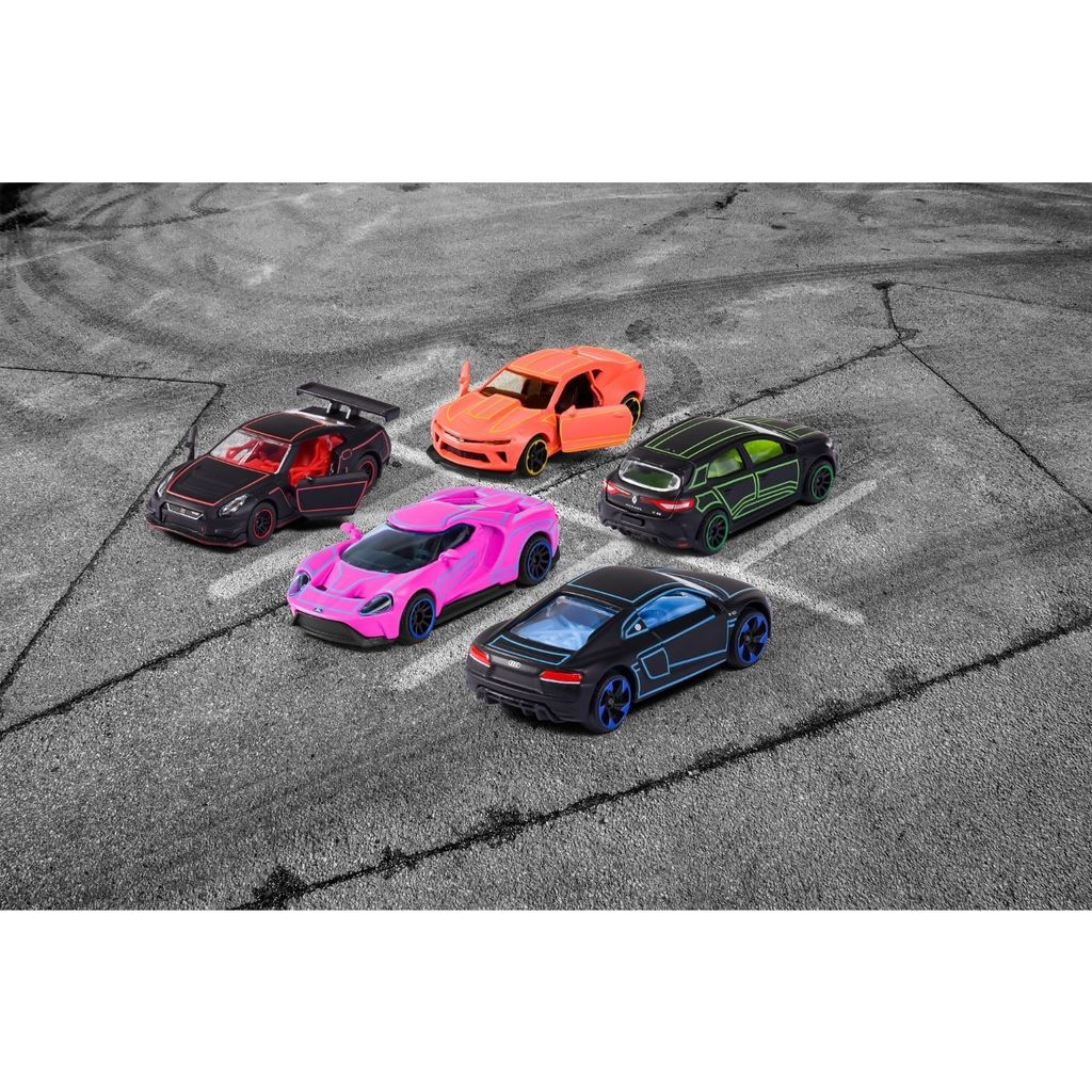 Majorette Light Racer Gift Pack er en 5-pak med legetøjsbiler i metal (med plastdetaljer). Light Racer kommer fra bilernes farver, som har et neonmønster på den matte lak.