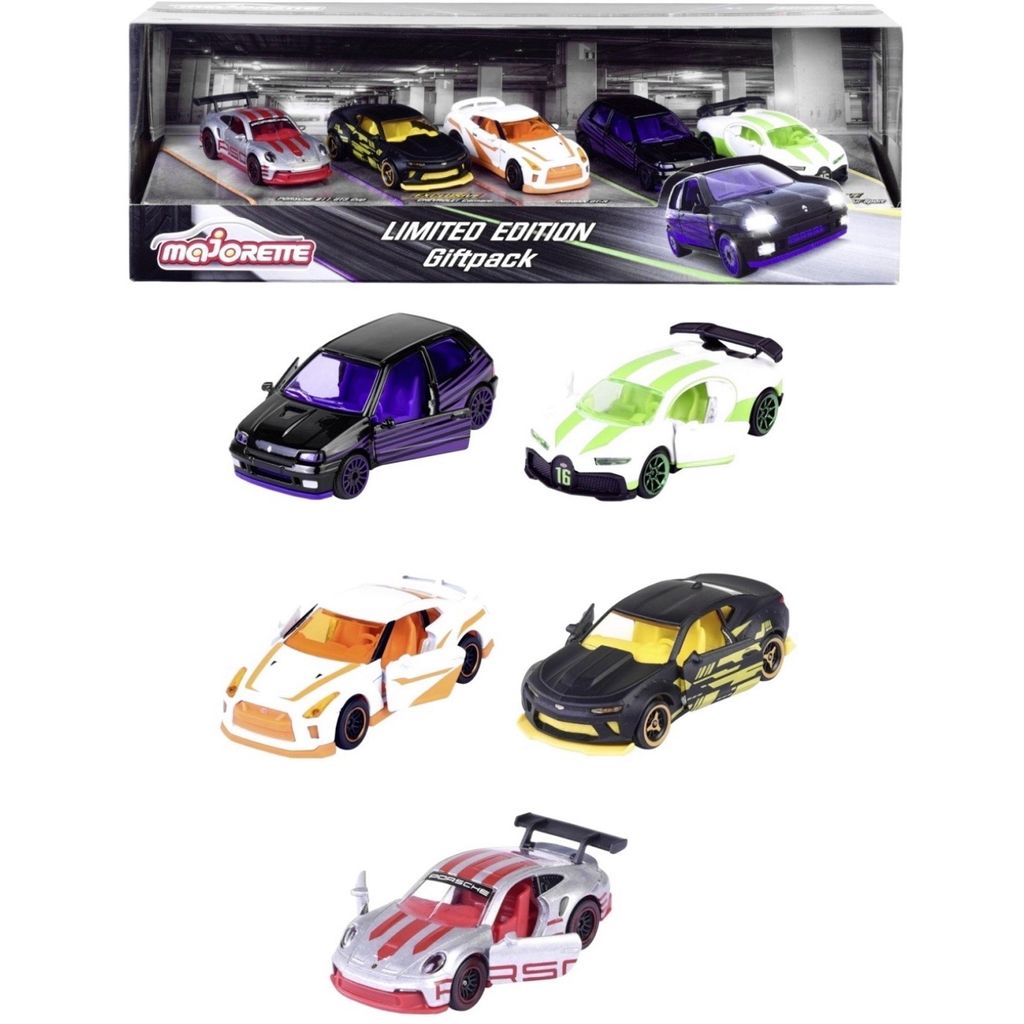 Sæt med fem Majorette-sportsbiler i en gaveæske. Bilerne er ca. 7,5 cm lange. Sættet hedder Limited Edition 10 og blev udgivet i 2024.