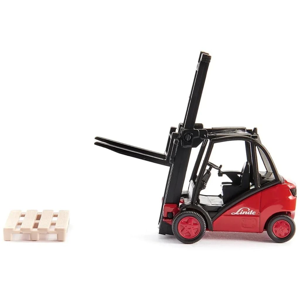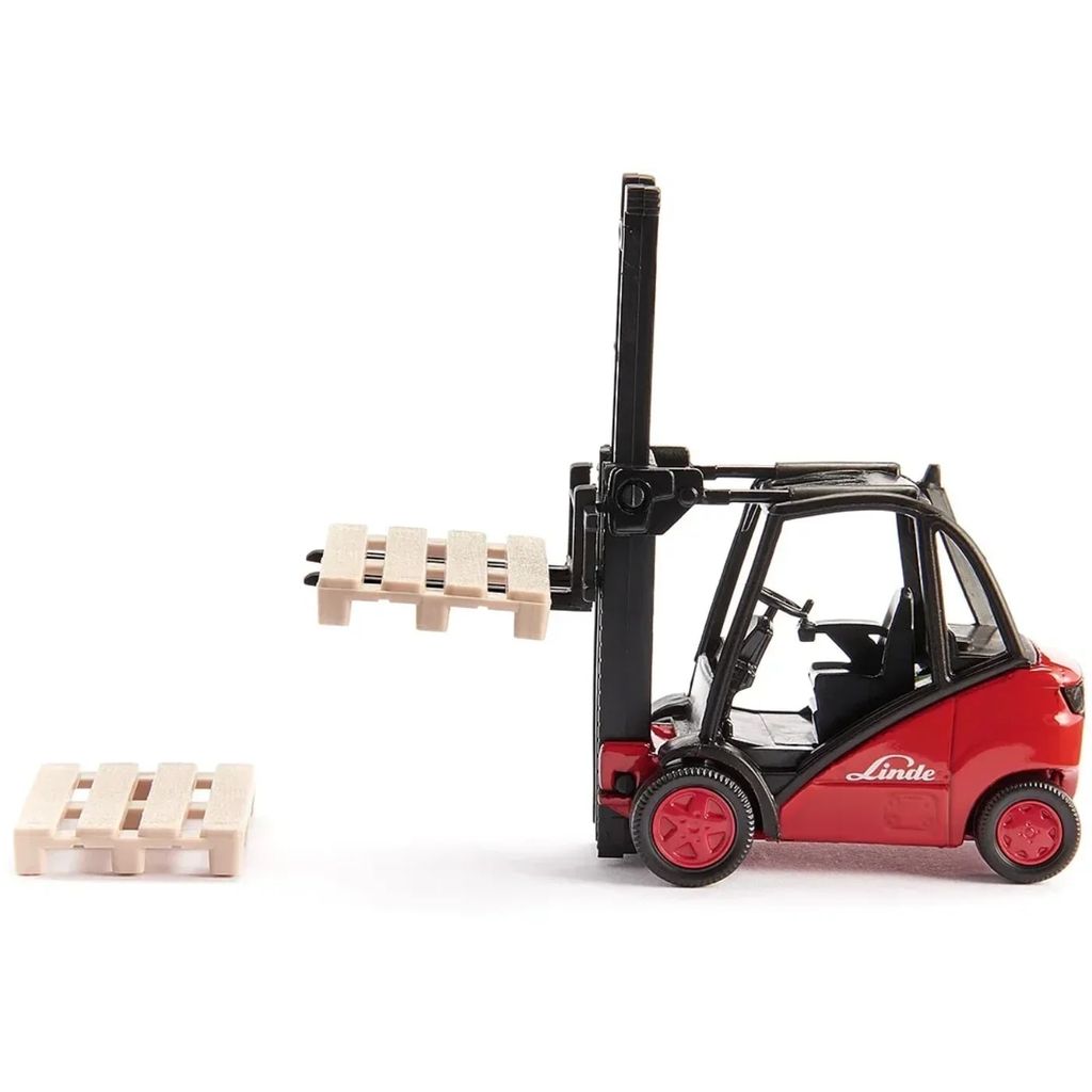 Linde gaffeltruck som legetøj i skala 1:50 (8,5 cm) fra Siku. Der medfølger to paller.