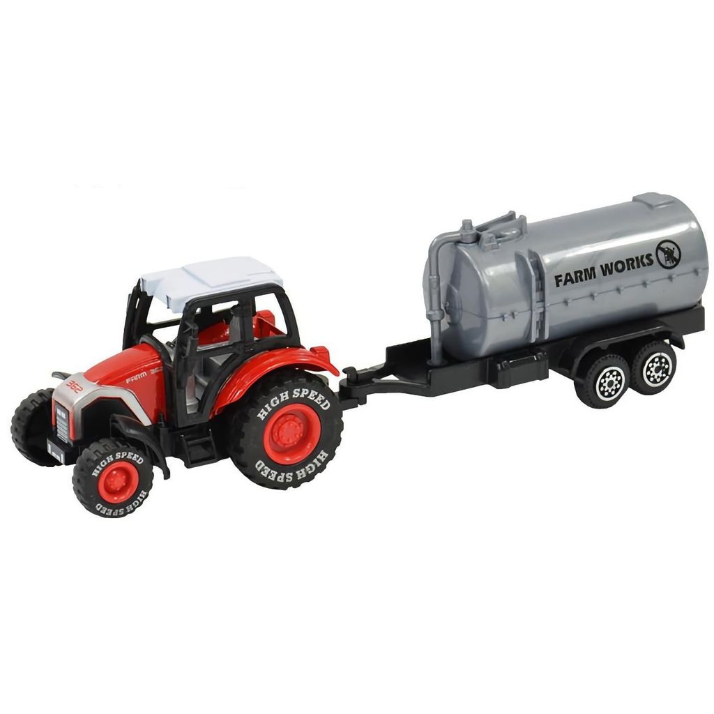 Lille legetøjstraktor med anhænger og tilbagetrækningsmotor fås i flere farver og med forskellige anhængere.