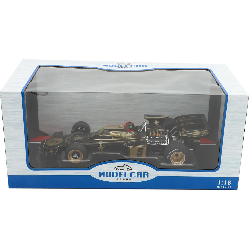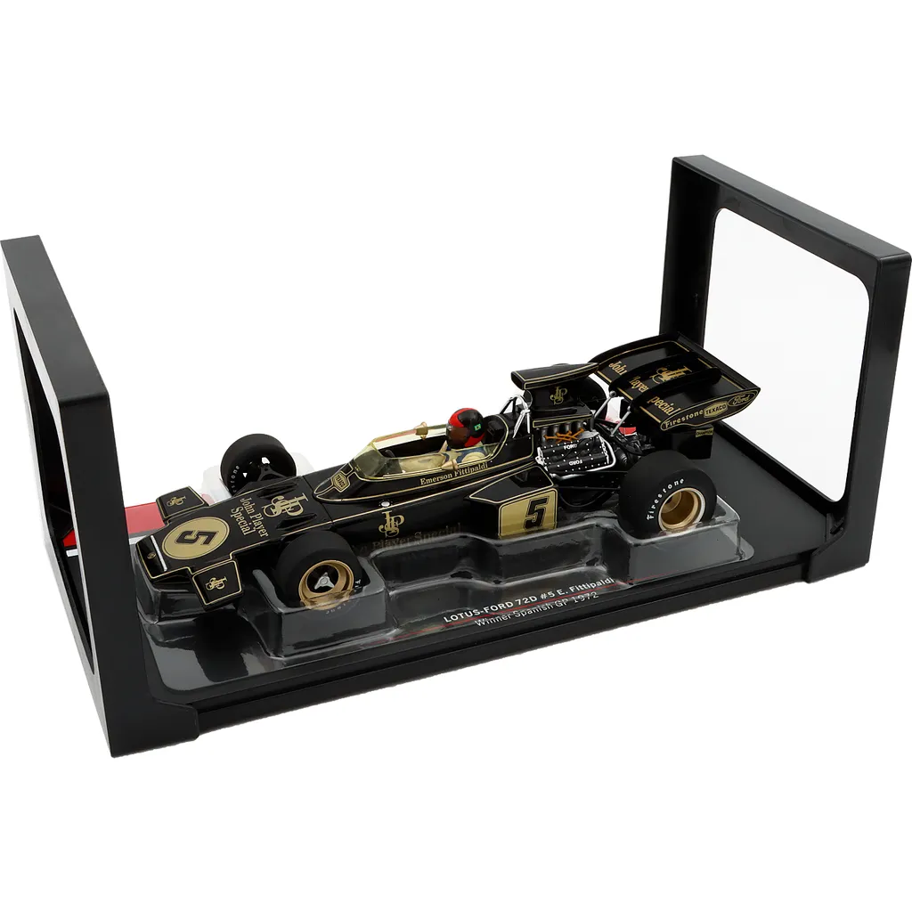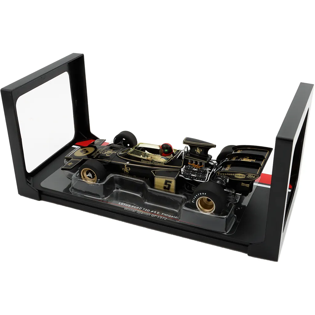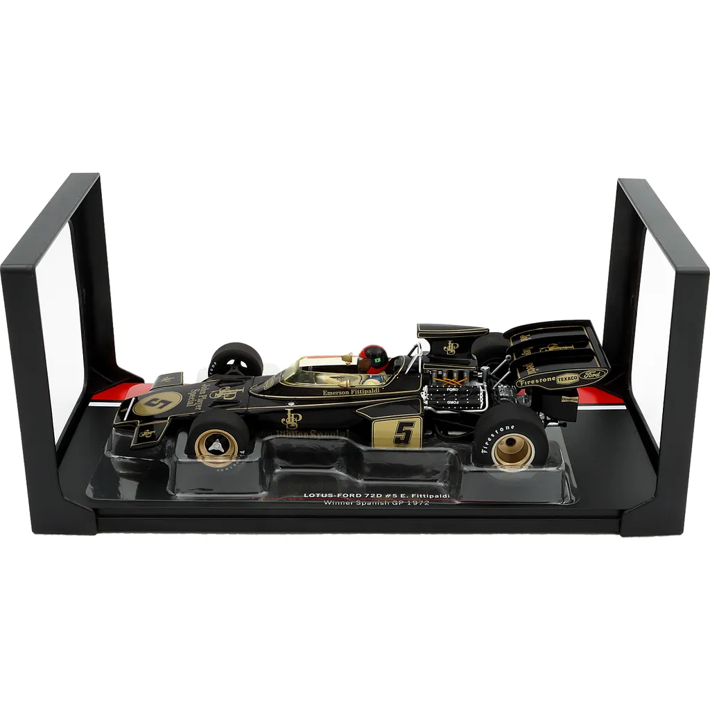 Lotus-Ford 72D med nummer 5 blev kørt af briten Emerson Fittipaldi under Spaniens Grand Prix i 1972. Denne modelbil er produceret af Modelcar Group i skala 1:18 (25 cm).