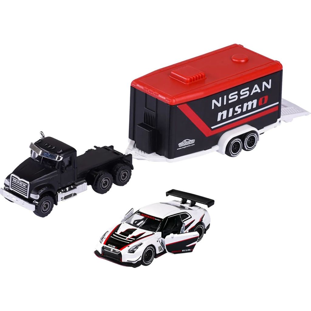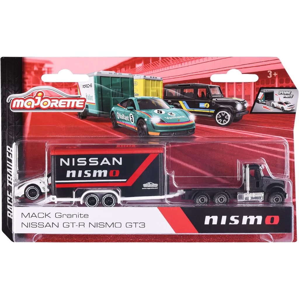 Racetrailer fra Majorette med en Mack Granite fra Mack Trucks, der trækker en overdækket trailer med en Nissan GT-R Nismo GT3. Bilerne udgør Nissan Nismo-racerteamet.
