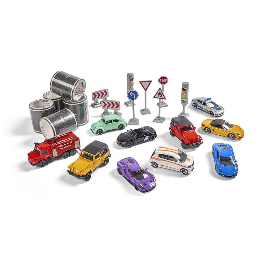 Stor pakke med legetøjsbiler, vejtape og tilbehør fra Majorette.