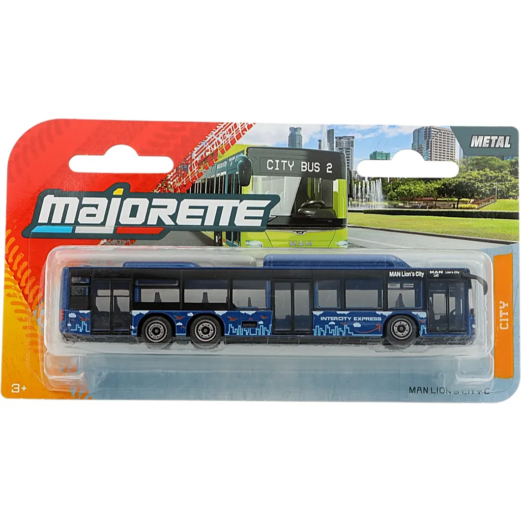 Blå bybus i form af en Lion's City C fra busproducenten MAN. Legetøjsbussen er fremstillet af Majorette i skala 1:110 (14,5 cm).