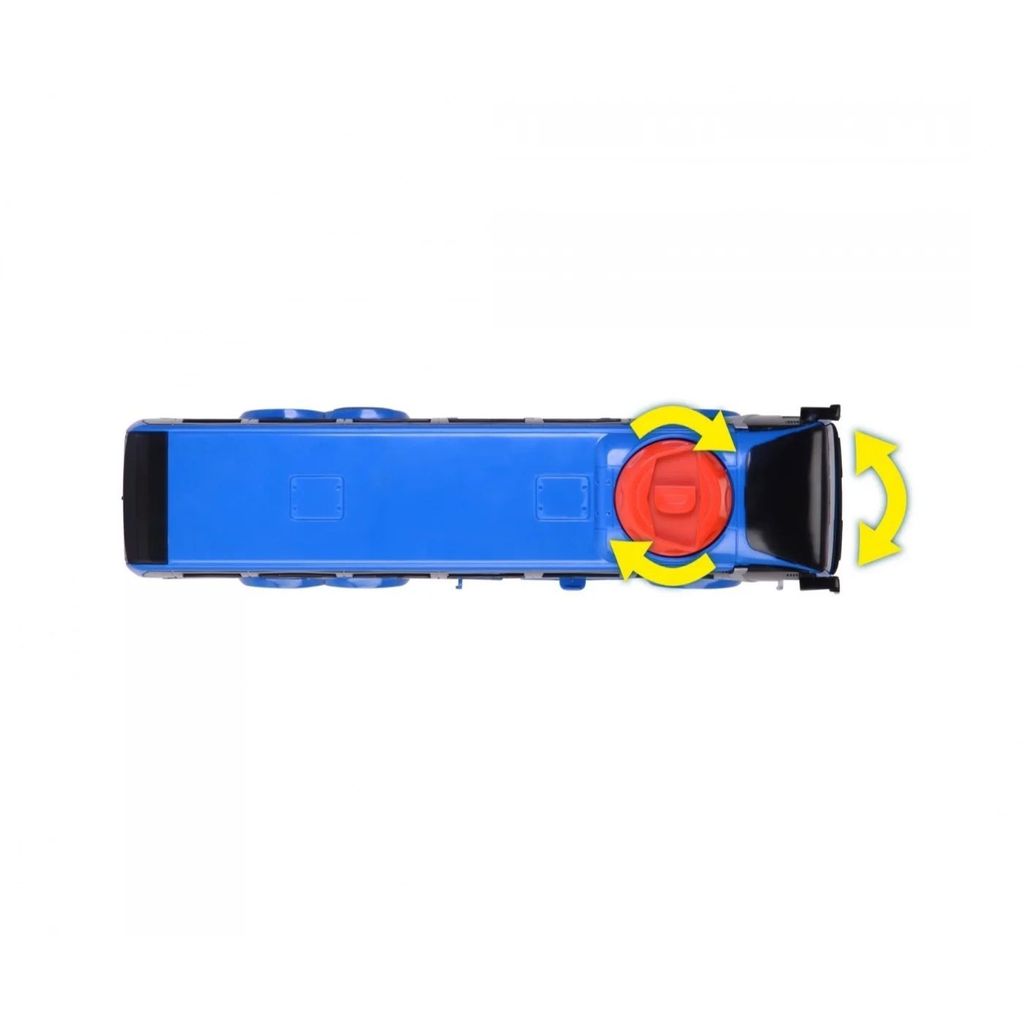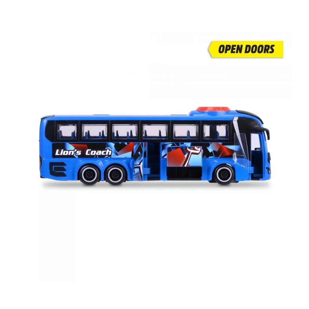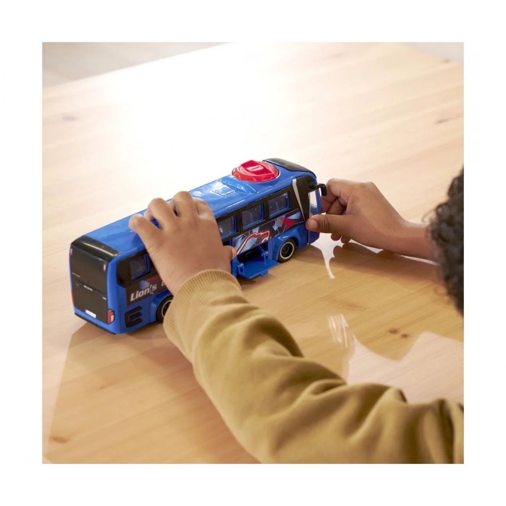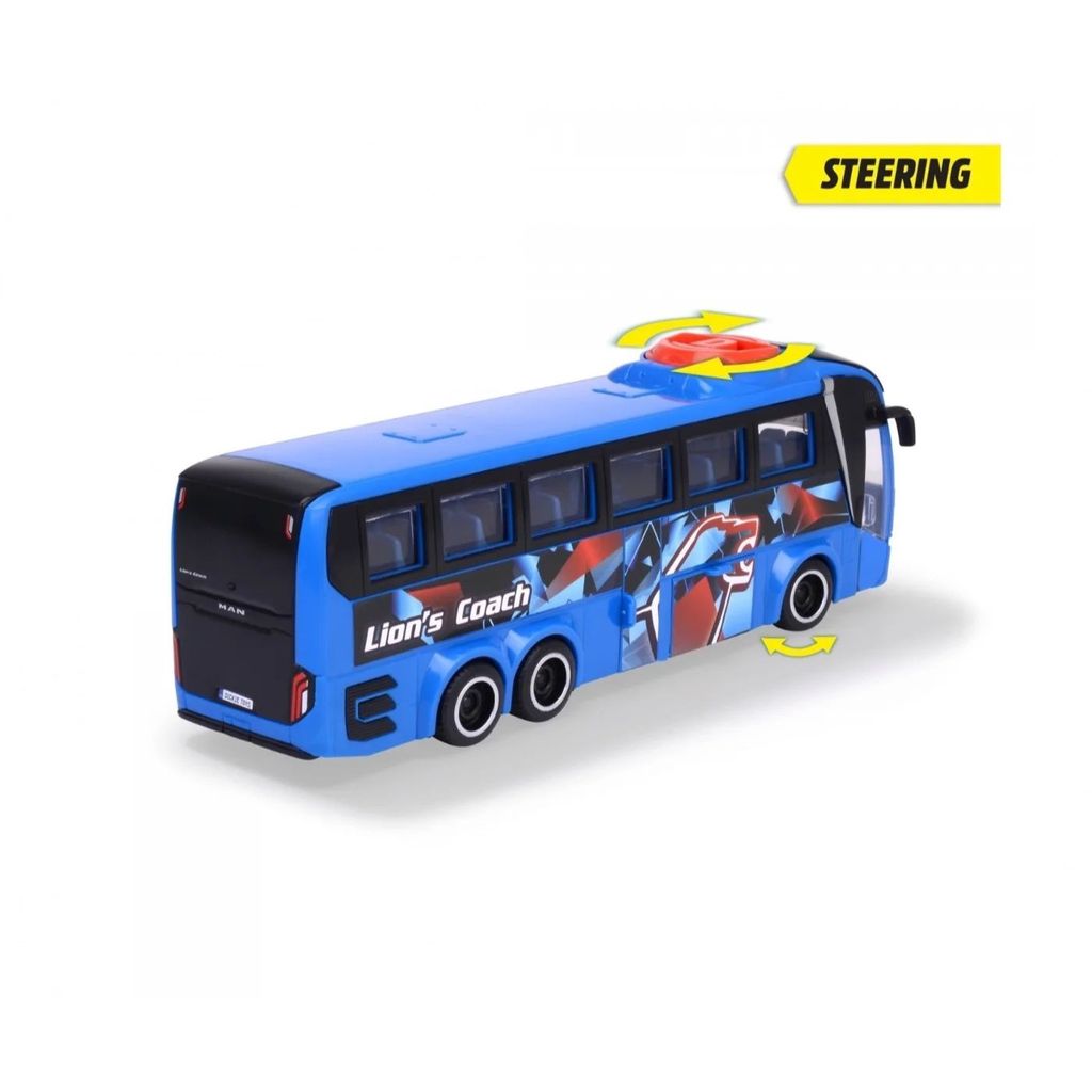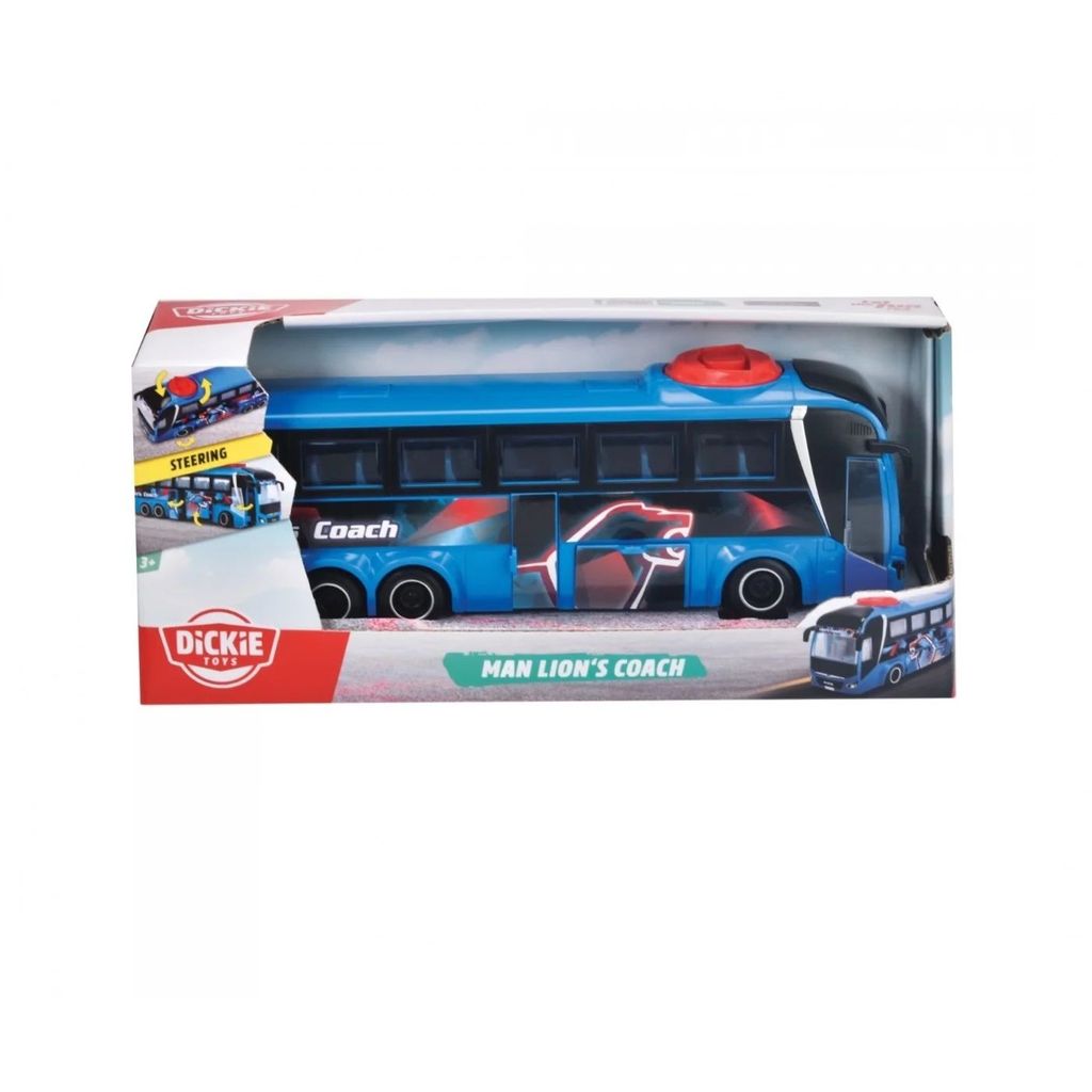 Blå MAN Lion's Coach-bus fra Dickie Toys. Bussen har en knop på taget, som kan drejes, så den kan dreje med forhjulene. To døre, der kan åbnes, og en bagklap, der kan åbnes.