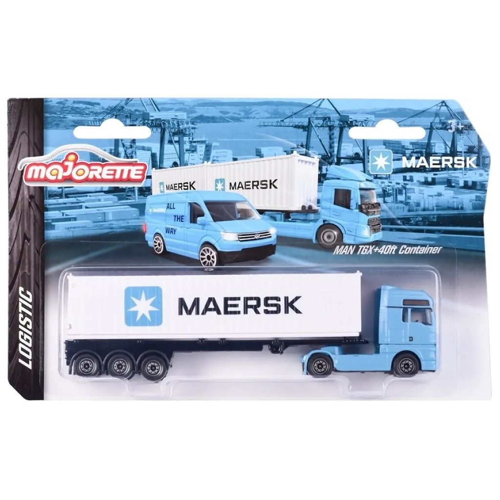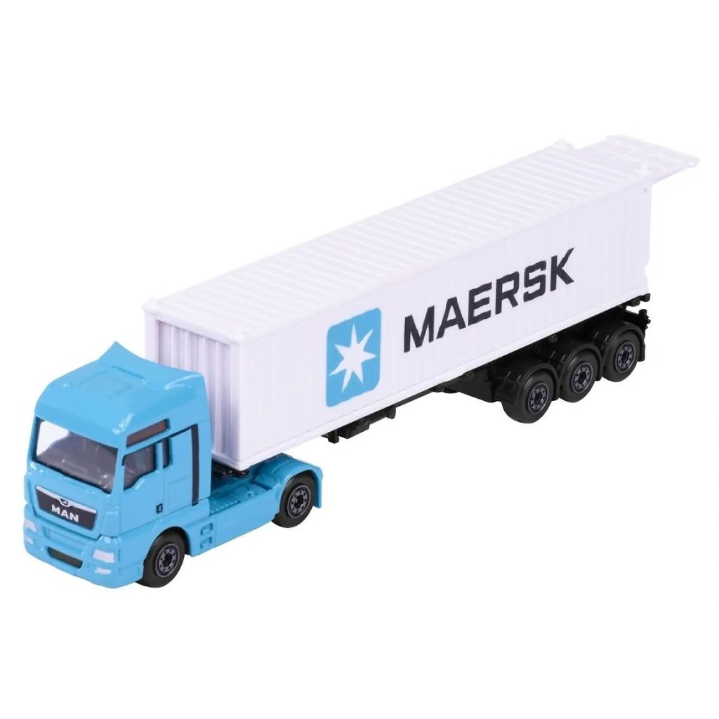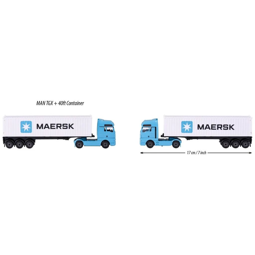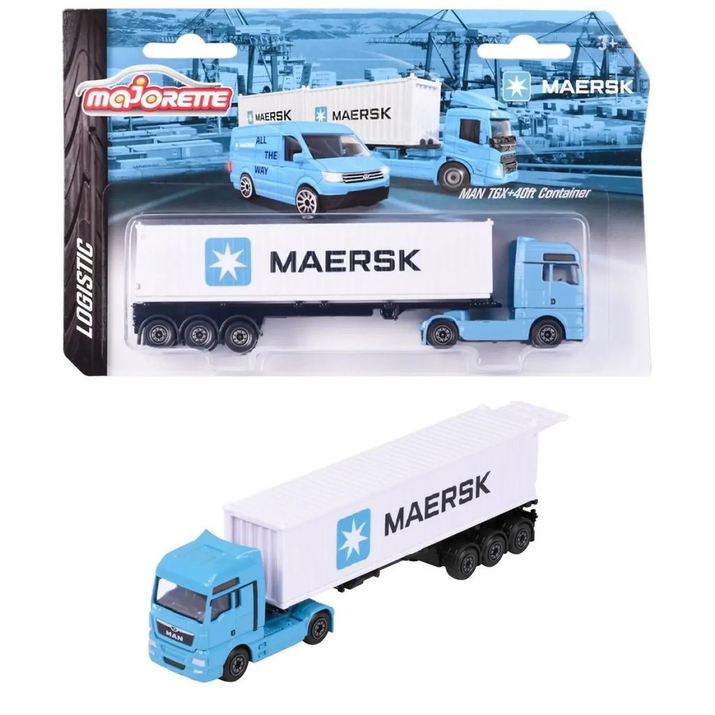 MAN TGX-trækkeren trækker en 40-fods container på en anhænger. Køretøjet er en del af Majorettes Logistic-serie med Maersk-tema.