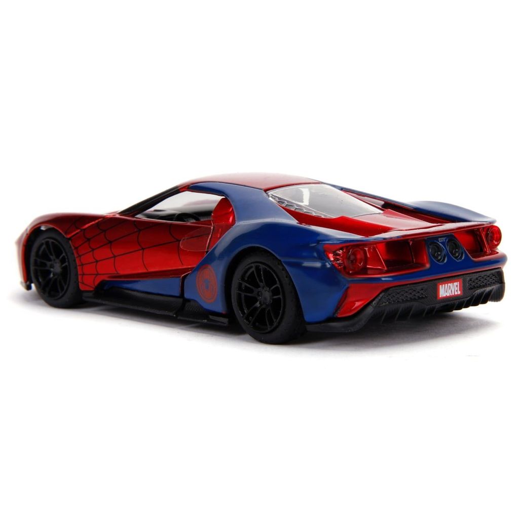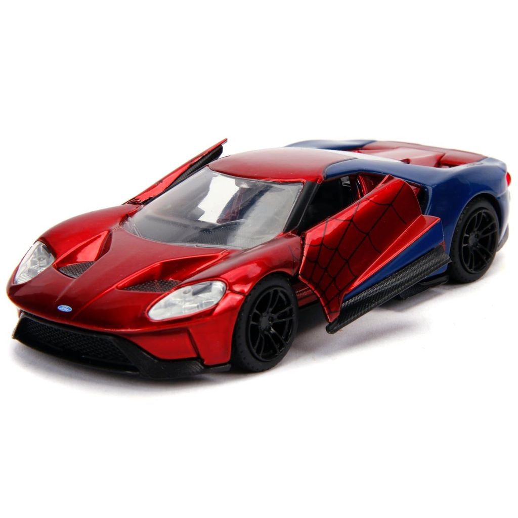 Marvel Spider-Man 2017 Ford GT i skala 1:32 fra Jada Toys. Bilen, som er lavet af metal med gummi- og plastikdetaljer, har døre, der kan åbnes, og frie hjul.
