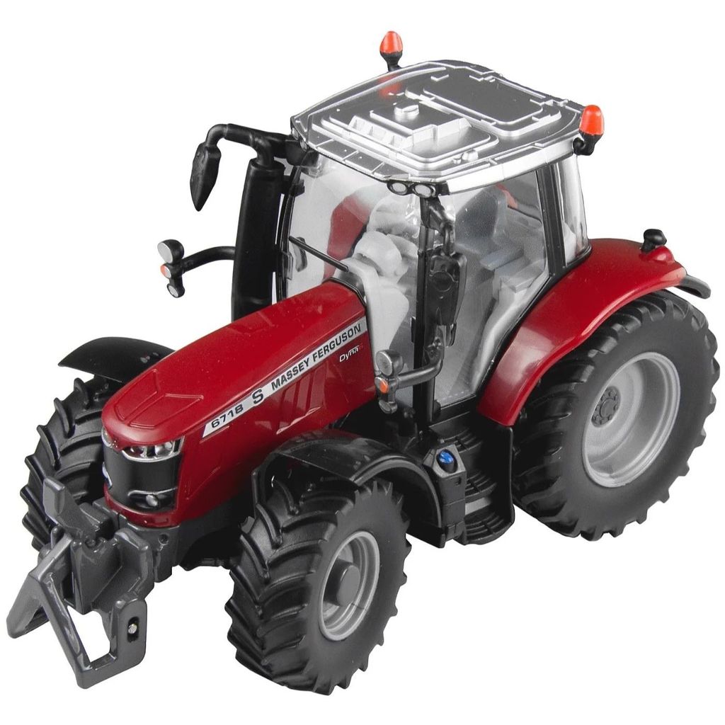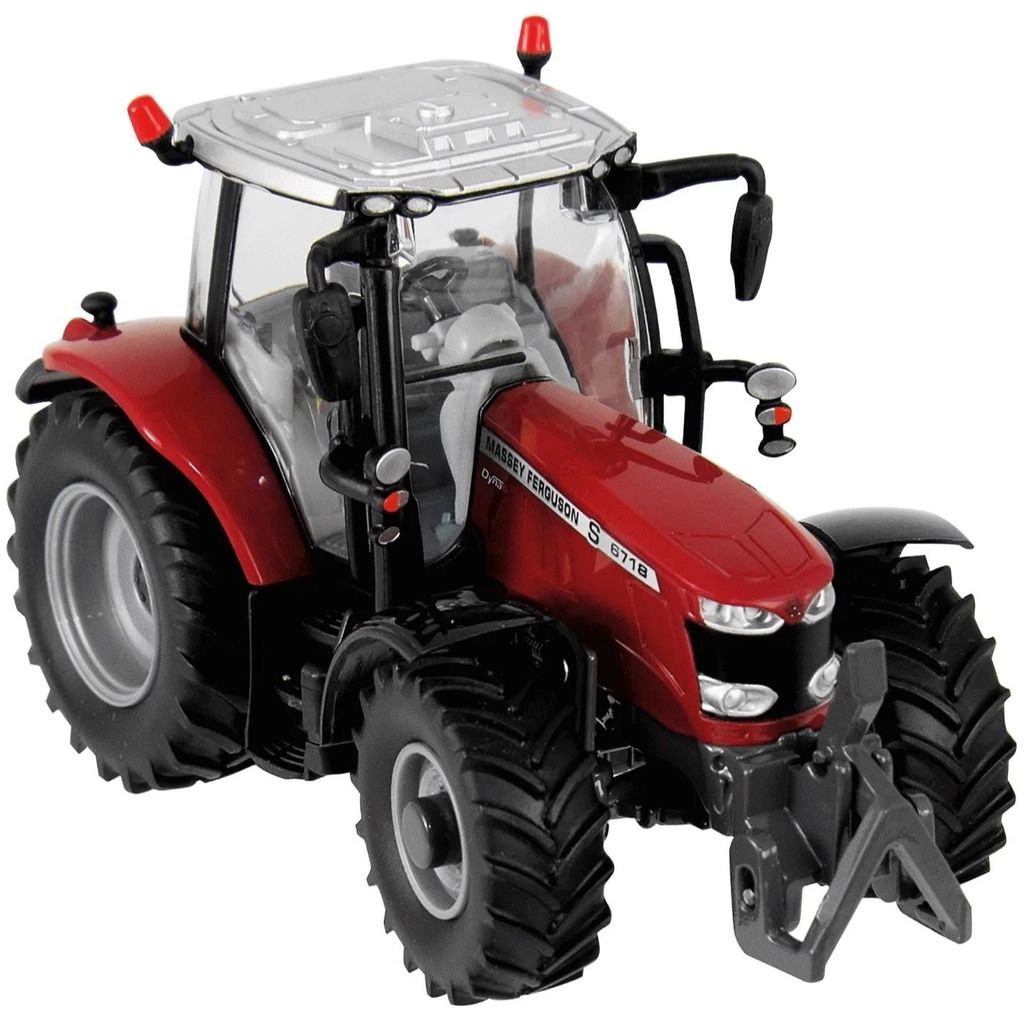 Trykstøbt traktor med plastdele og gummidæk. Traktoren er en rød Massey Ferguson 6718 S 1:32 (16 cm).