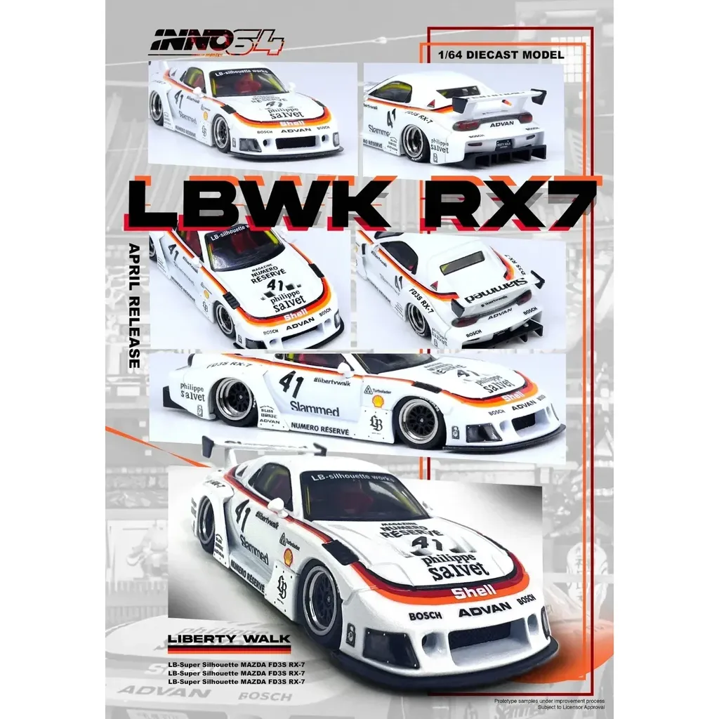 Mazda RX7 (FD3S) LB-Super Silhouette (LBWK / Liberty Walk) fra Inno64 (Inno Models) i skala 1:64 (7,2 cm).