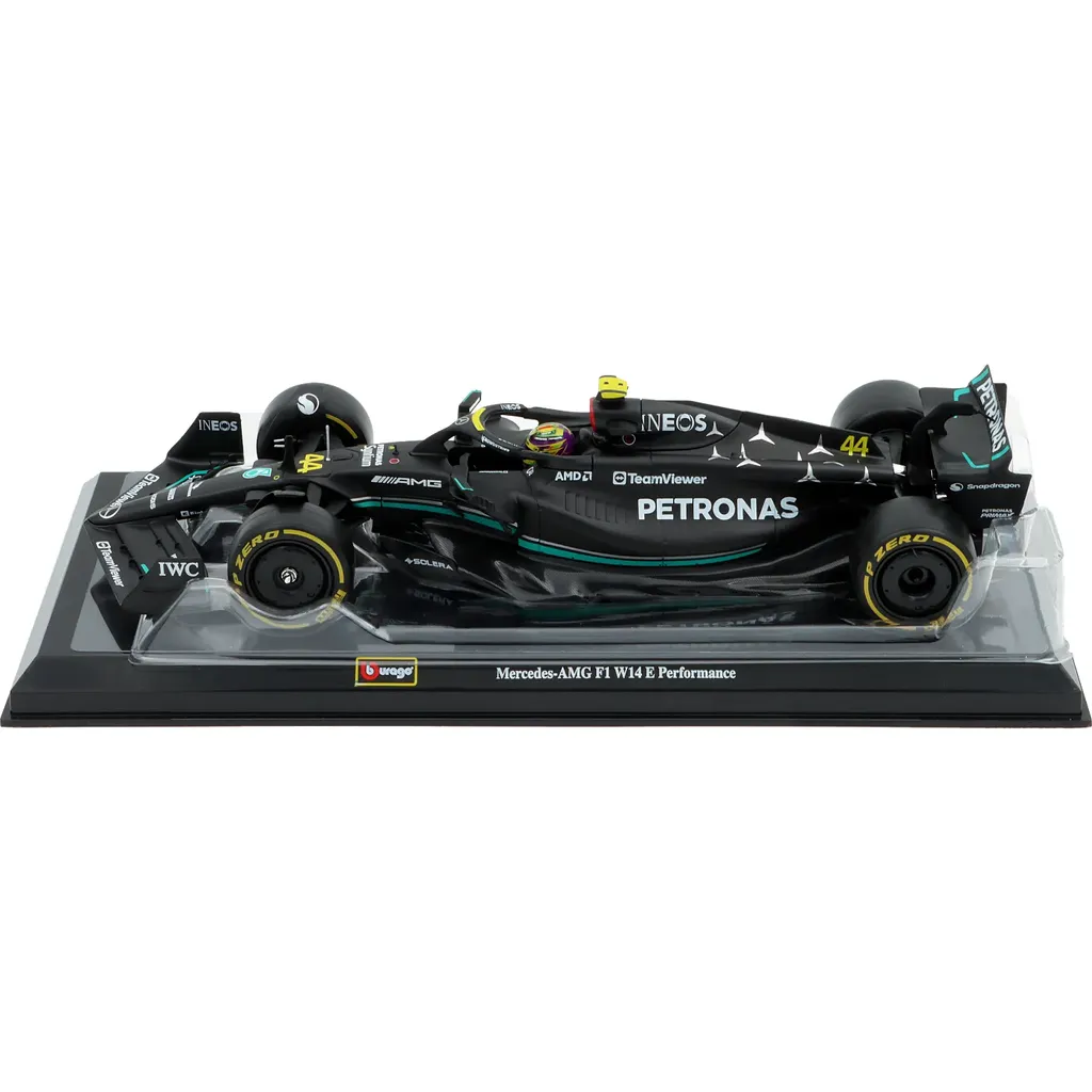 Model af Formel 1-bilen Mercedes-AMG F1 W14 E Performance. Denne bil, nummer 44, blev kørt i sæsonen 2023 af Lewis Hamilton, som sluttede på tredjepladsen med 234 point i sæsonen. Bilen er en del af Mercedes-AMG PETRONAS F1 Team fra Brackley i Storbritannien.