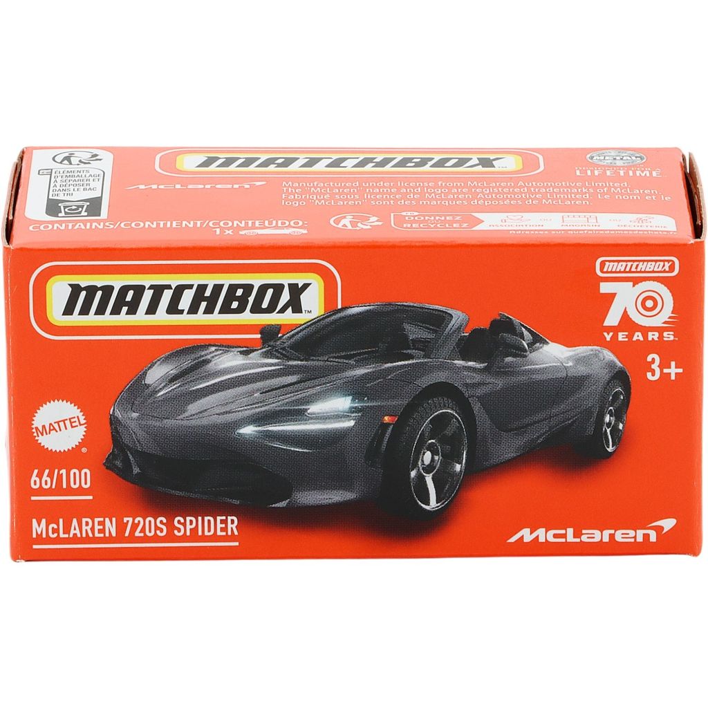Sort McLaren 720S Spider fra Matchbox og Power Grab-serien, hvor denne legetøjsbil er bil nummer 66/100.