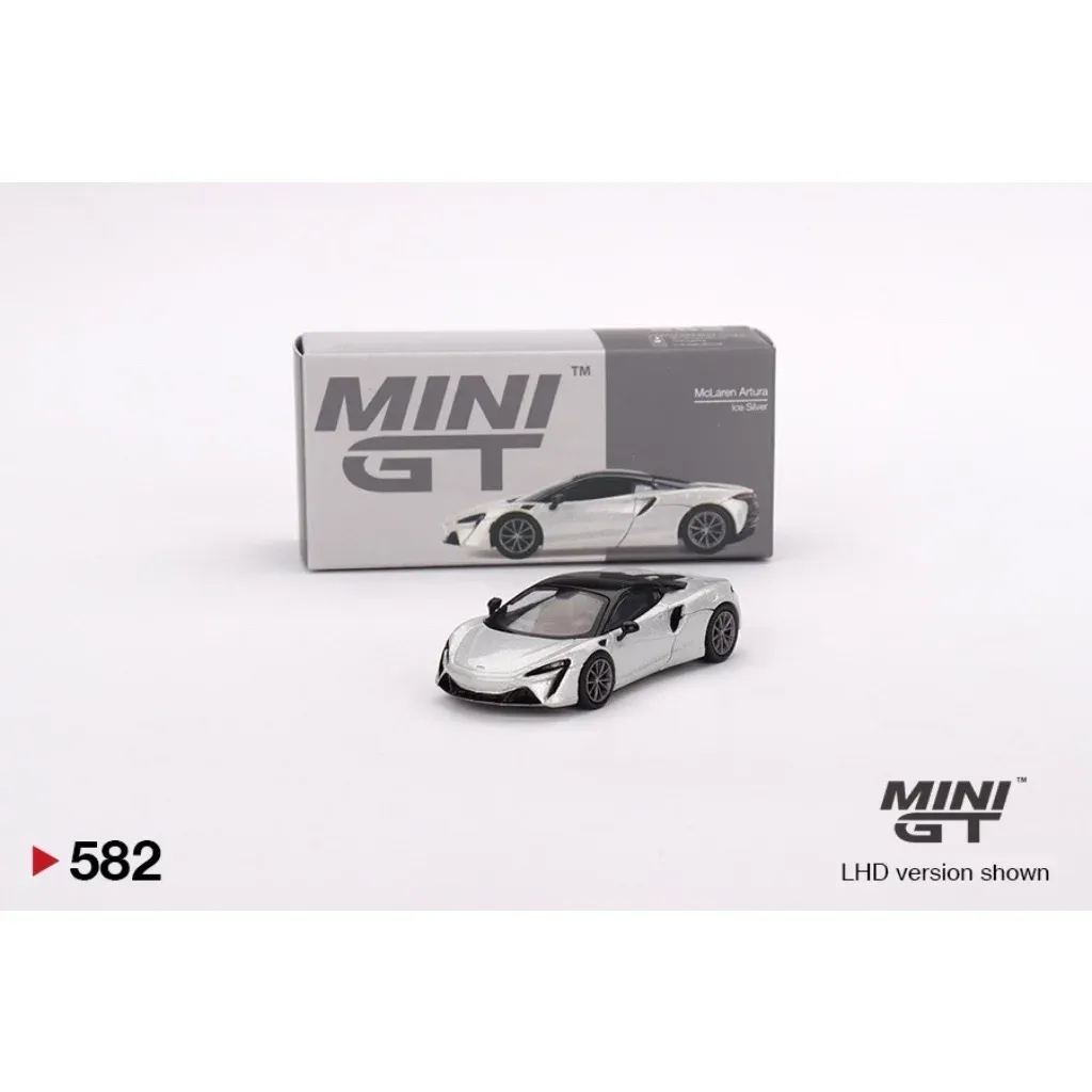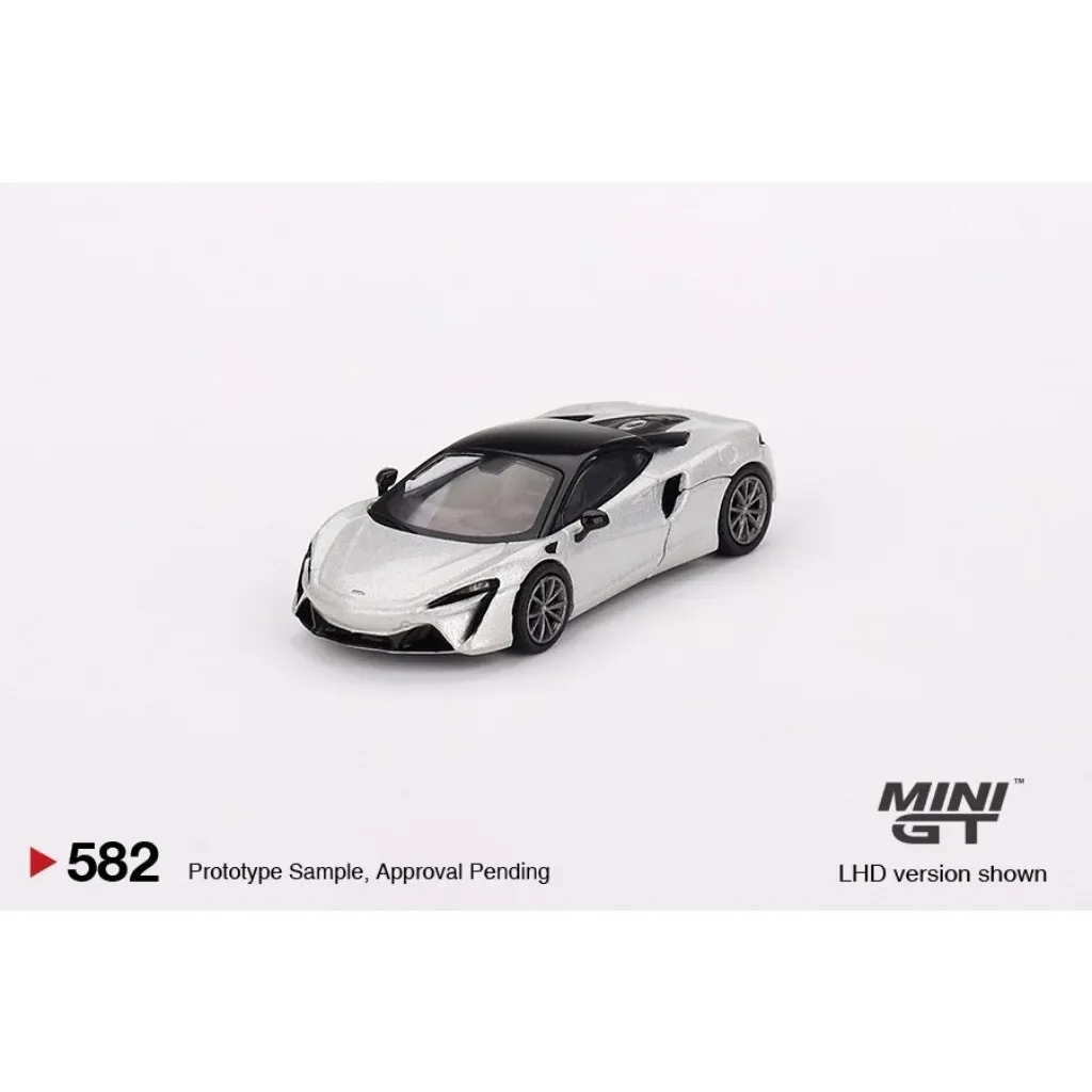 McLaren Artura i sølv (Ice Silver) fra Mini GT i skala 1:64 (ca. 7 cm). Bilen har produktnummer 582 hos Mini GT. Denne version er venstrestyret (LHD) med rattet i venstre side.