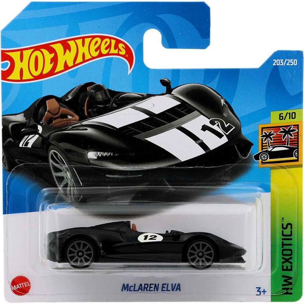 McLaren Elva fra Hot Wheels og HW Exotics-serien, hvor denne legetøjsbil er bil nummer 6/10. Bilen er nummer 203/250 fra 2022 og har et kort kort (5785).