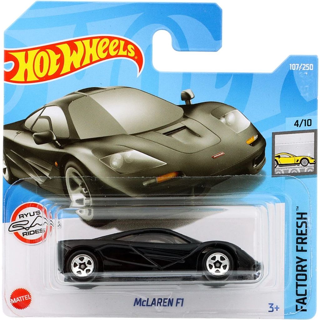 McLaren F1 fra Hot Wheels og Factory Fresh-serien, hvor denne legetøjsbil er bil nummer 4/10. Bilen er nummer 107/250 fra 2022 og har et kort kort (5785).