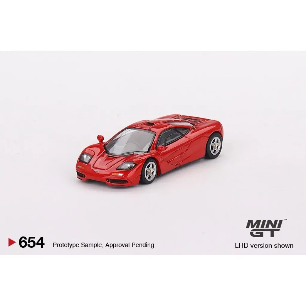 McLaren F1 i rød fra Mini GT i skala 1:64 (ca. 7 cm). Bilen har produktnummer 654 hos Mini GT. Denne version er venstrestyret (LHD) med rattet i venstre side.